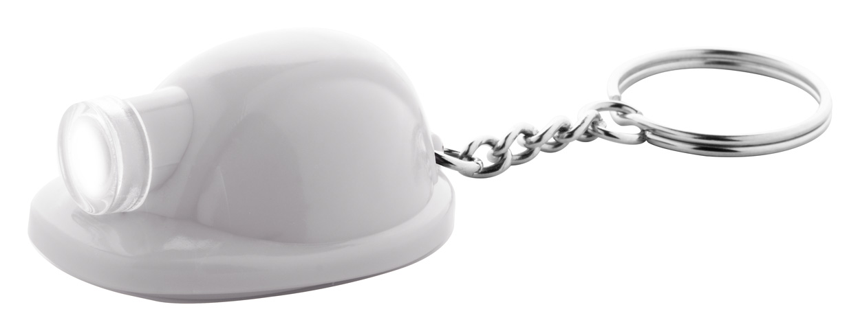Schlüsselring in Form eines Bauhelms aus Kunststoff, mit LED-Taschenlampe. Inkl. Knopfzellenbatterie.