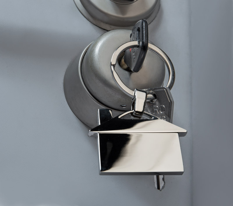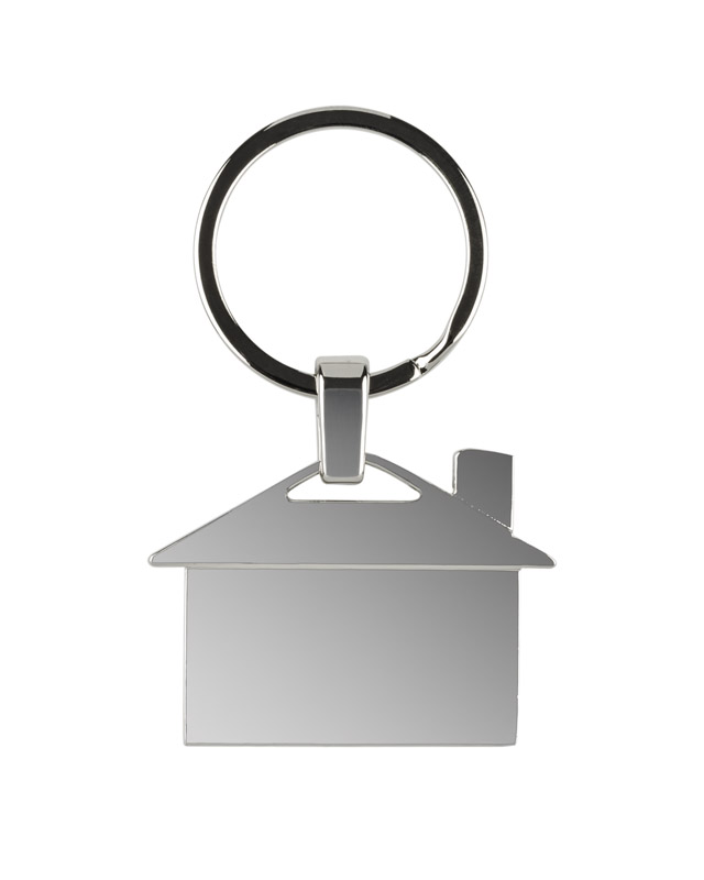 Schlüsselanhänger in Form eines Hauses. Das Logo wird auf dem Schlüsselanhänger graviert.