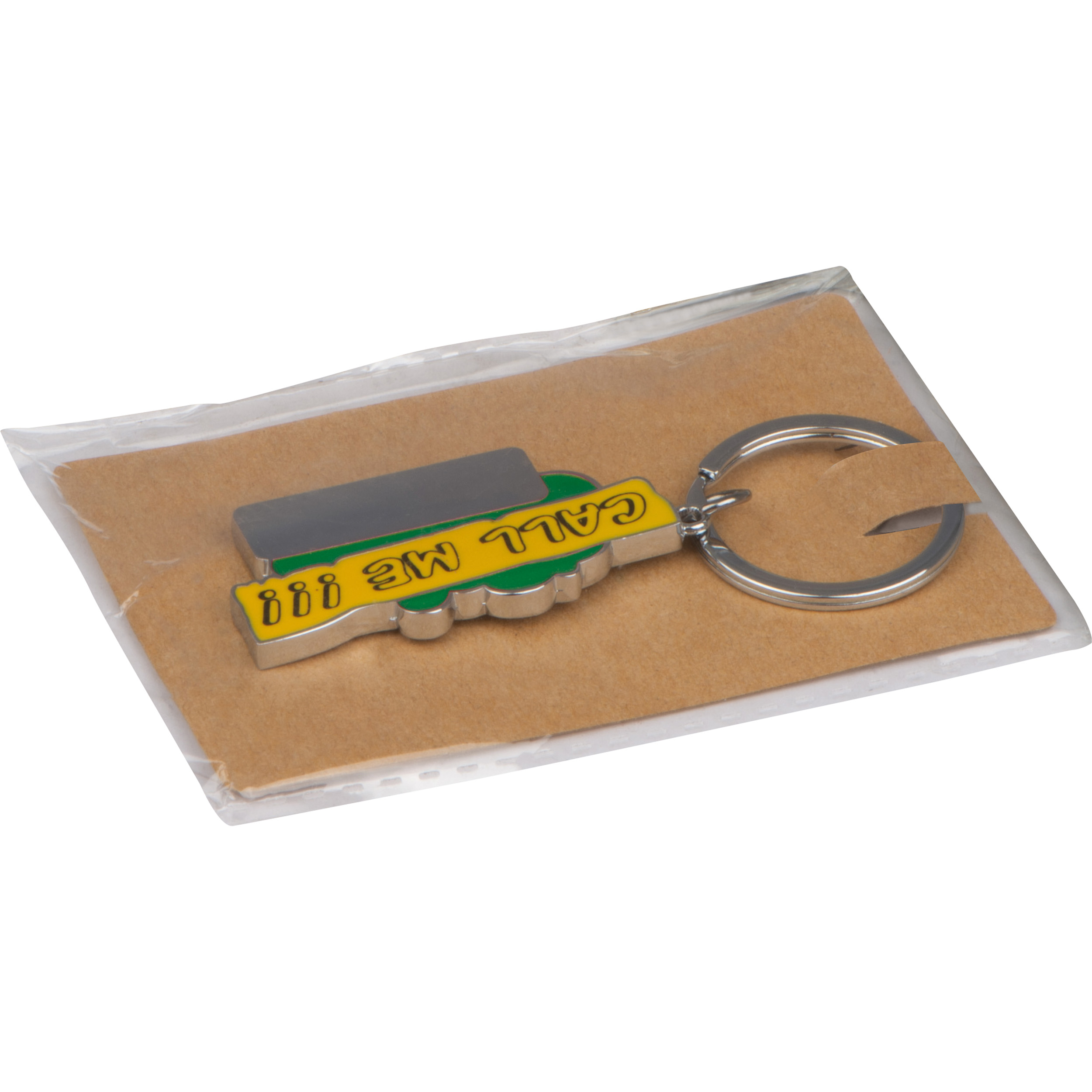 Schlüsselanhänger aus Metall mit farblich lackierter Vorderseite. Ihre Werbung wird auf das dafür vorgesehene Feld gelasert.