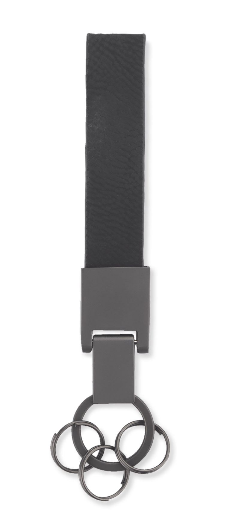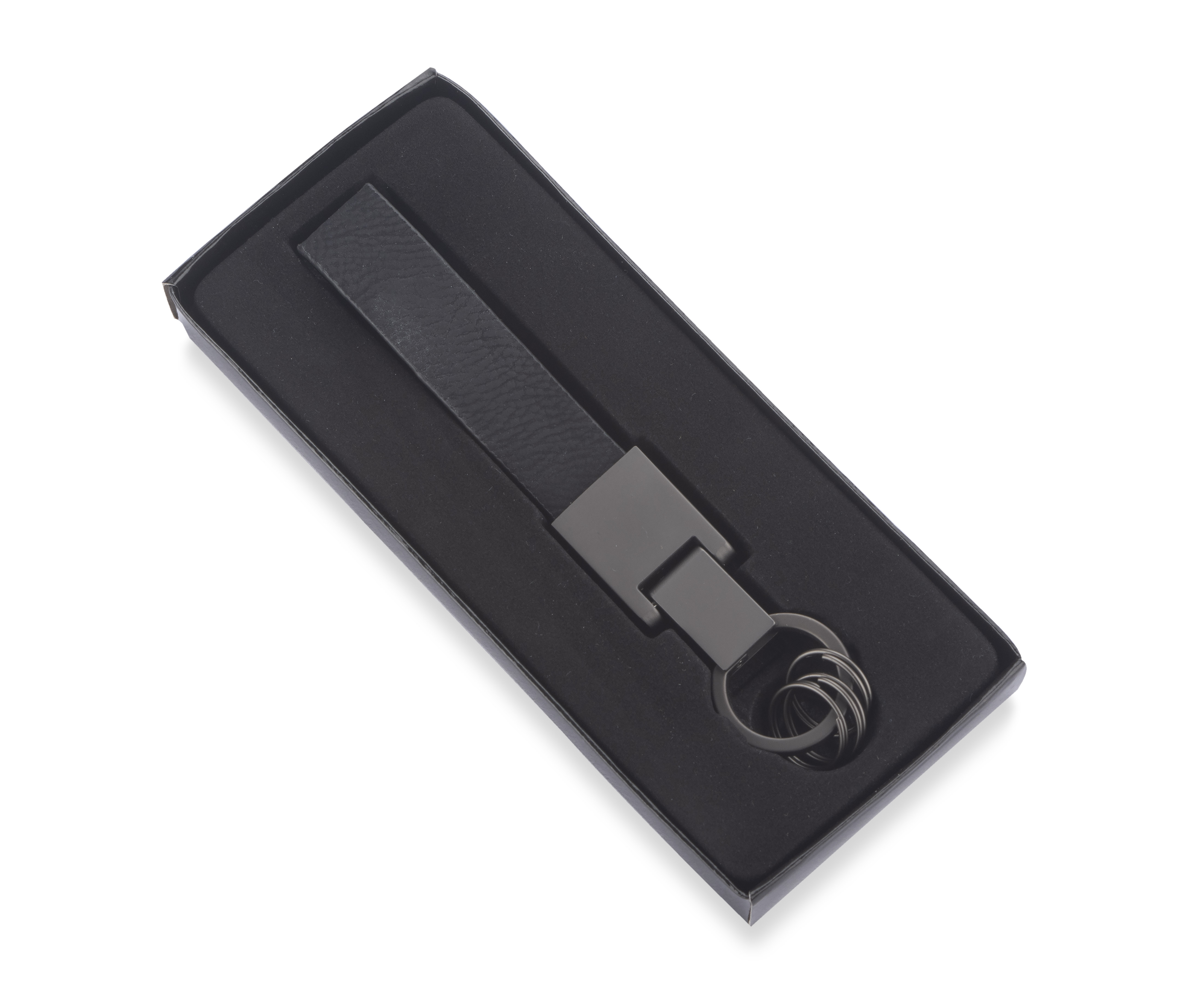 Der Schlüsselanhänger DERI ist ein elegantes Werbegeschenk aus hochwertigem Kunstleder mit dunklen Metallakzenten. Sein minimalistisches Design und die drei zusätzlichen Ringe ermöglichen eine einfache Organisation von Schlüsseln oder das Anbringen von Accessoires. Das Ganze ist in einem stilvollen Karton verpackt, wodurch der Anhänger perfekt als Firmengeschenk geeignet ist.