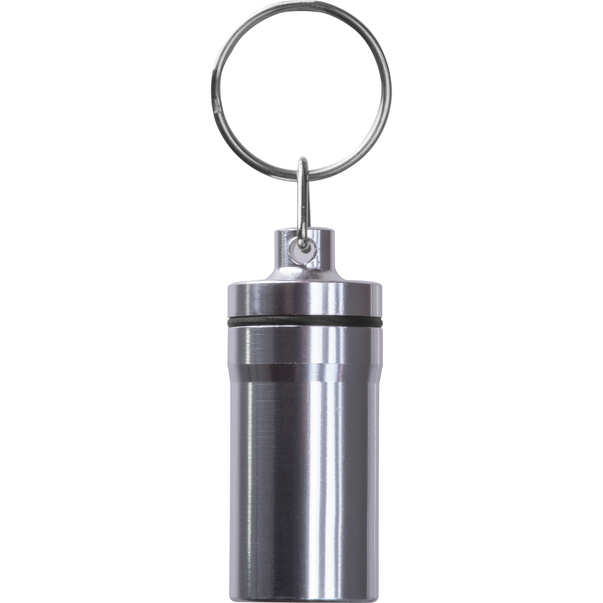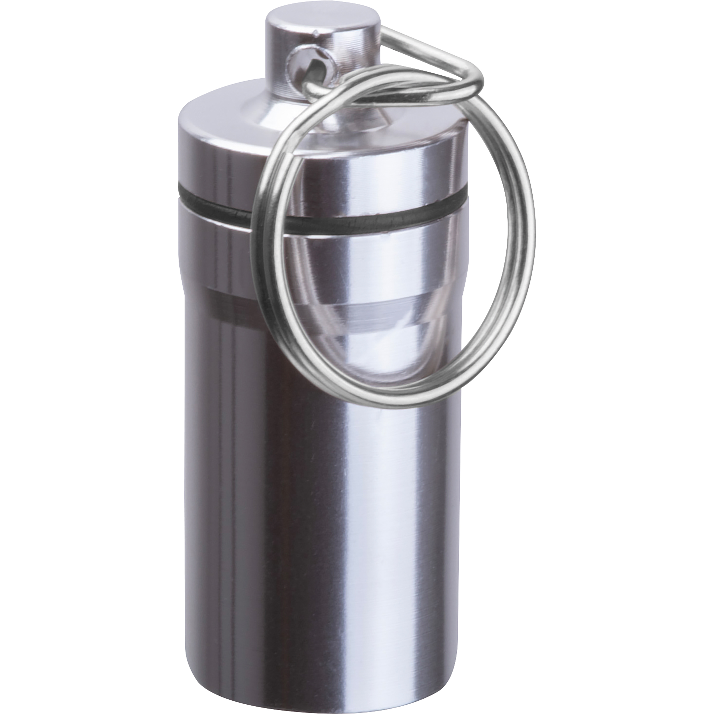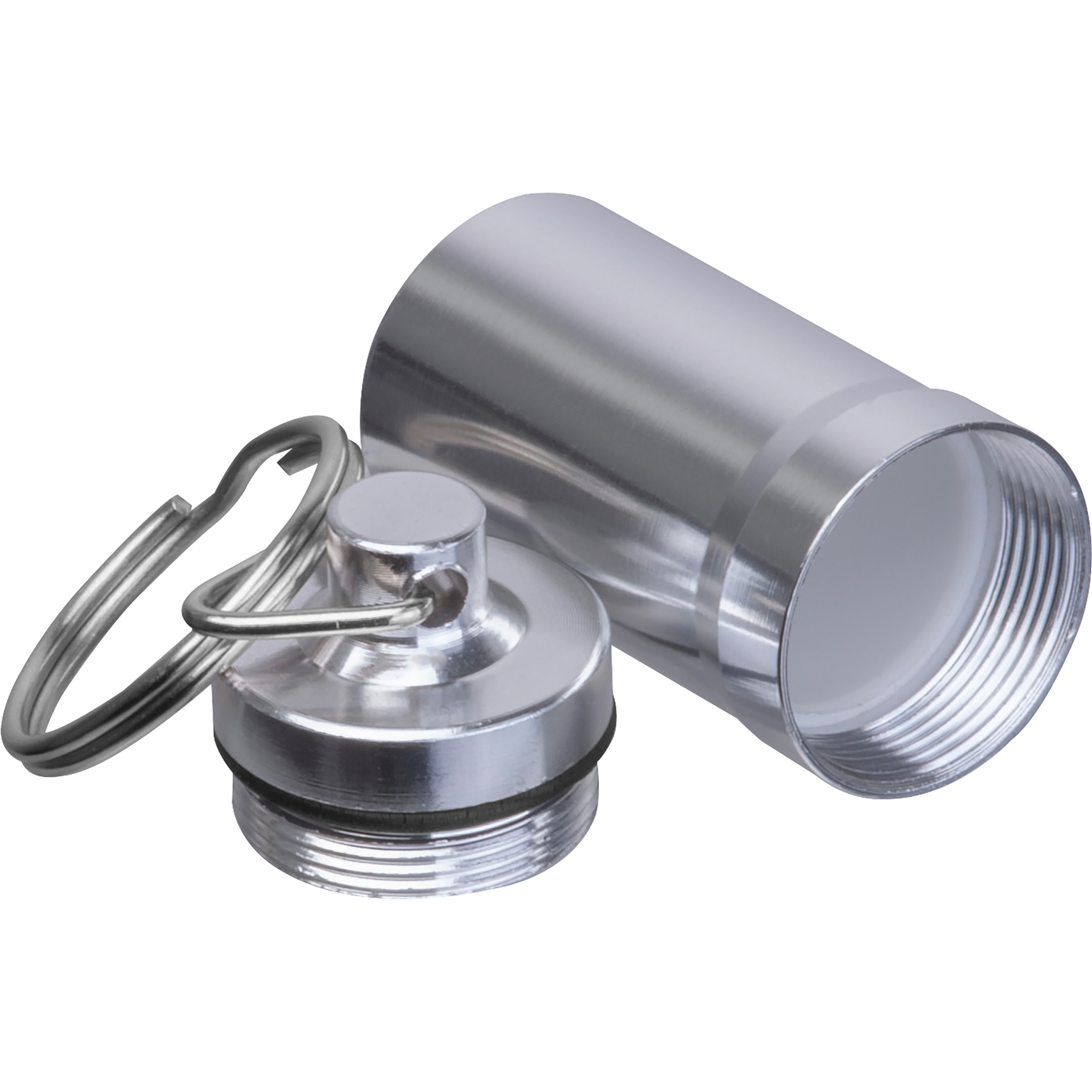 Schlüsselanhänger Döschen mit Edelstahl Außenseite und Kunststoff Innenraum. Ideal zur sicheren Aufbewahrung kleiner Dinge unterwegs. Ihre Werbung gravien wir auf das Döschen.