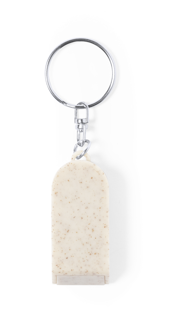 Natur Linie Schlüsselanhänger mit Smartphone-Halterung, hergestellt aus Weizenstroh. Mit Drehmechanismus und mitgeliefertem Bildschirmreinigungszubehör. Verchromter Metallring. Weizenstroh fördert die Verwendung von natürlichen Rohstoffen und reduziert den Schadstoffausstoß.
