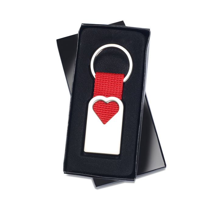 Metall-Schlüsselanhänger in Herzform. Mattes Finish mit Polyester-Strap. Verpackt in passender Geschenkbox.