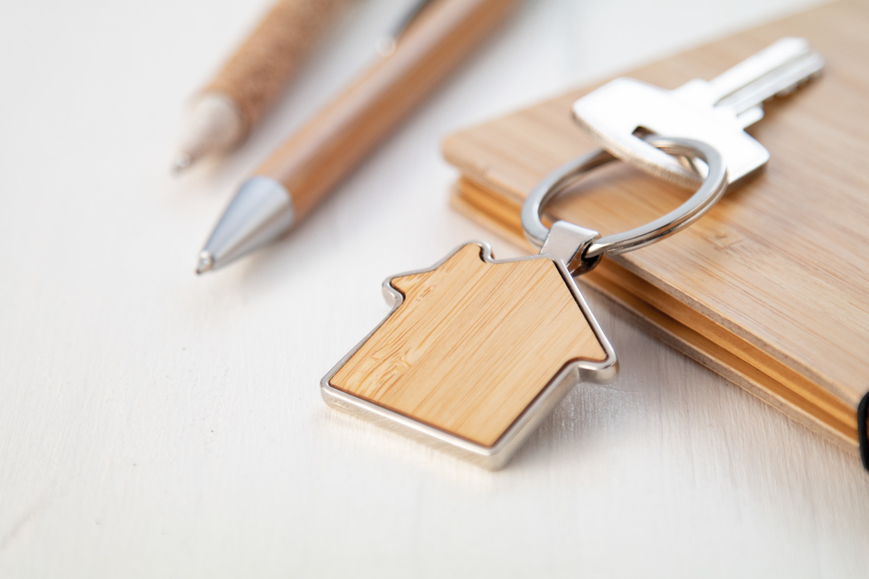 Haus-förmiger Metallschlüsselanhänger mit Bambuseinsatz. Einzeln in Pappschachtel.