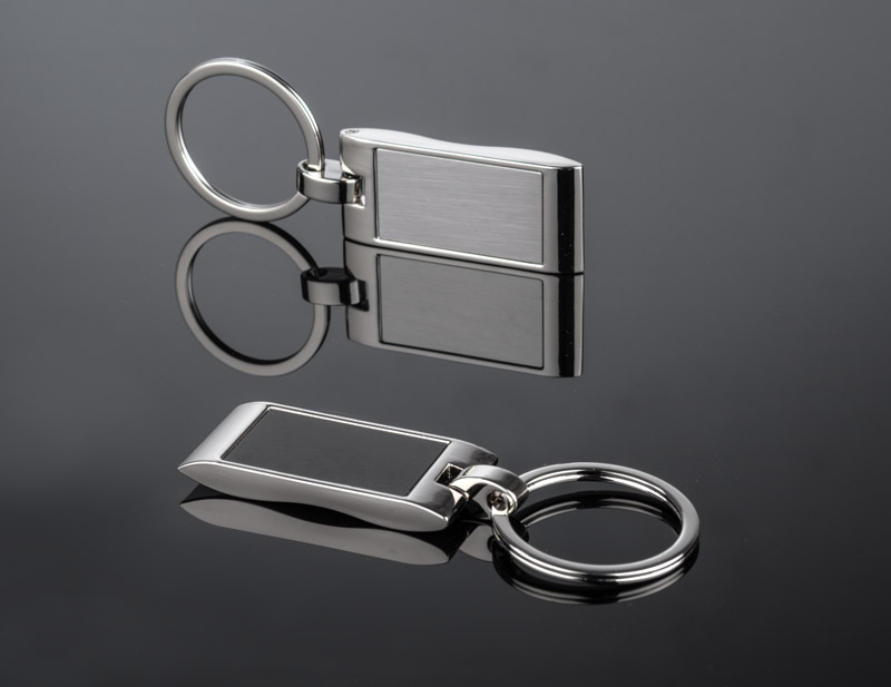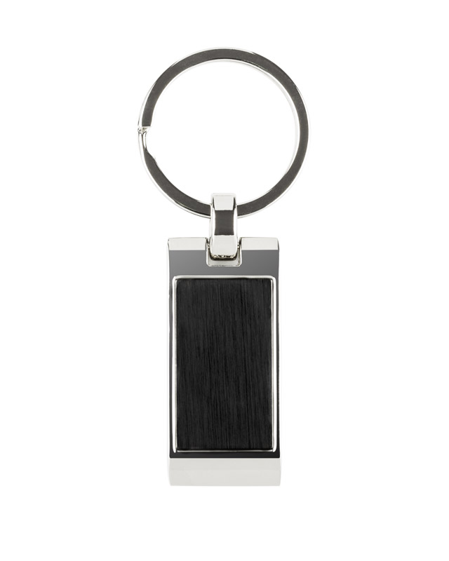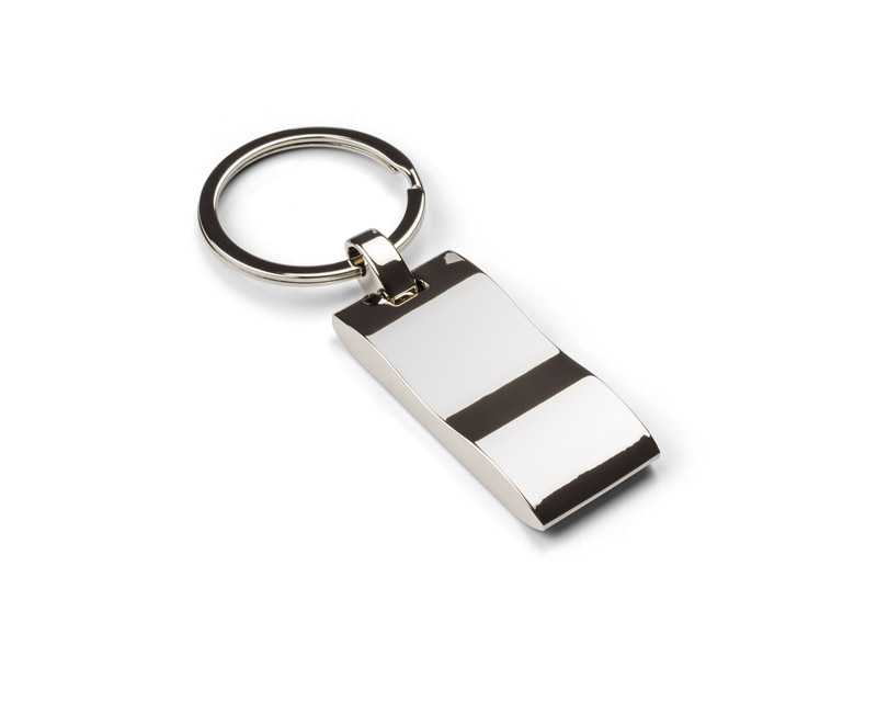 Schlüsselanhänger mit rechteckigem und gewelltem Anhänger. Das Logo wird auf der Fläche graviert.