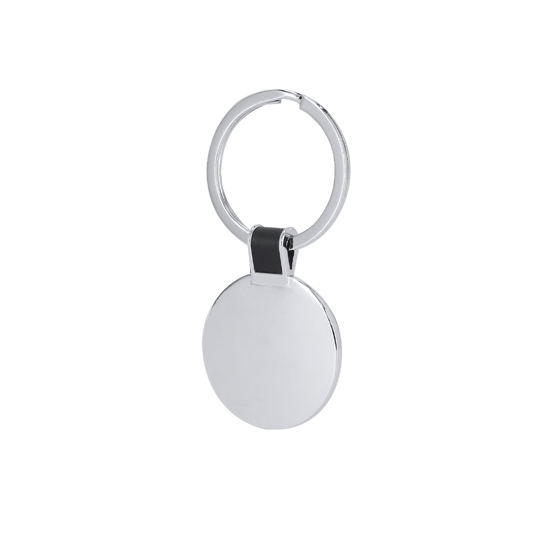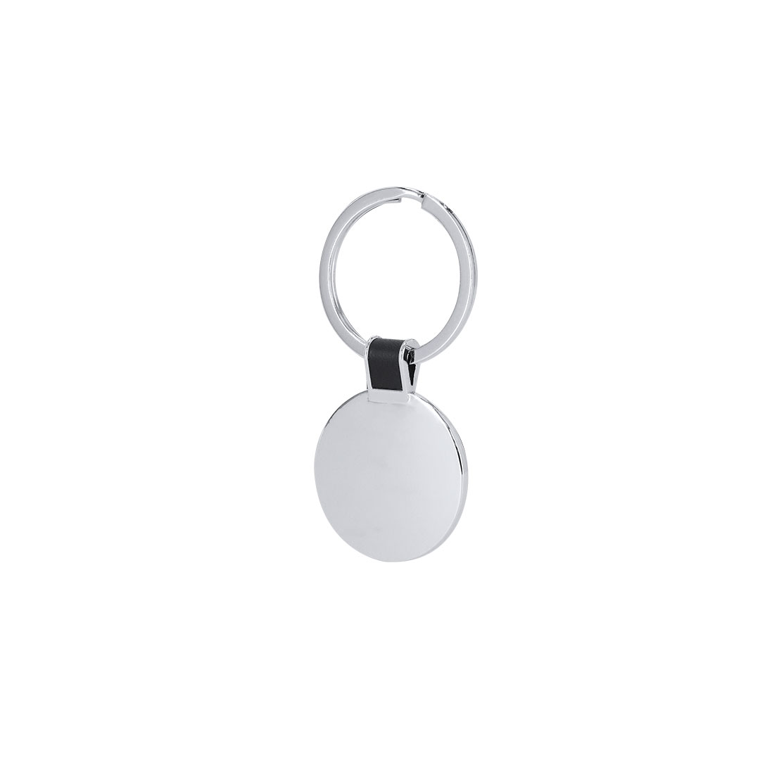 Metallischer Schlüsselanhänger mit Detail in Schwarz.