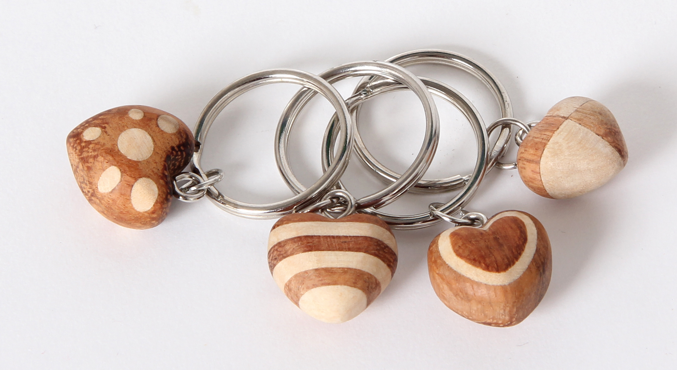 Kleines Holzherz mit praktischem Schlüsselring. Verschiedene Designs erhältlich: Streigen, Herz, Punkte oder Karo.
