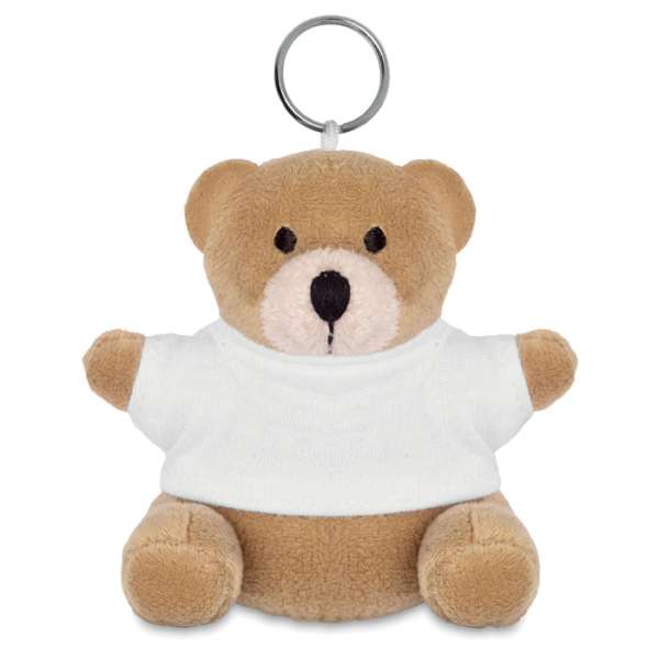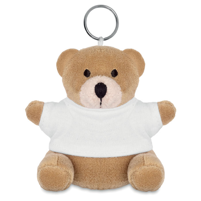 Schlüsselring mit Teddy-Bär. Der Bär trägt ein T-Shirt aus 100% Baumwolle. Ideal zum Veredeln.