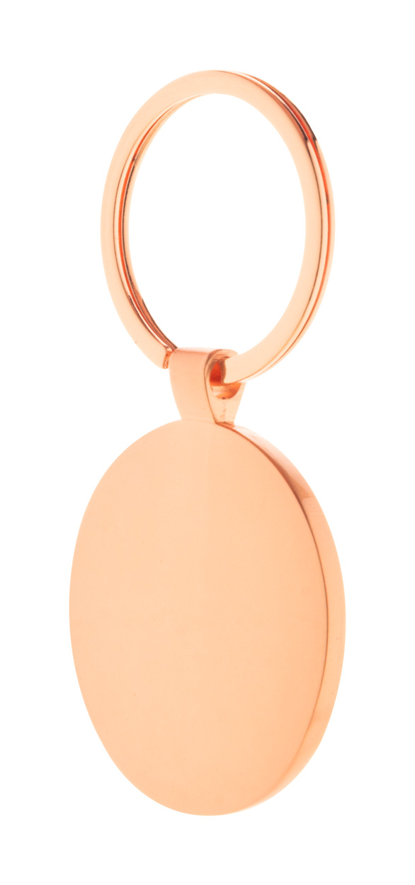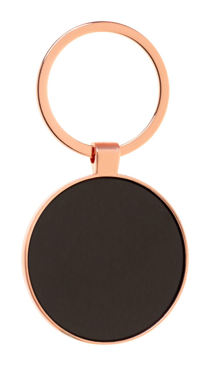 Runder Metallschlüsselanhänger mit goldfarbener Oberfläche mit Gunmetal-Plättchen. Einzeln in Kraftpapierbox.