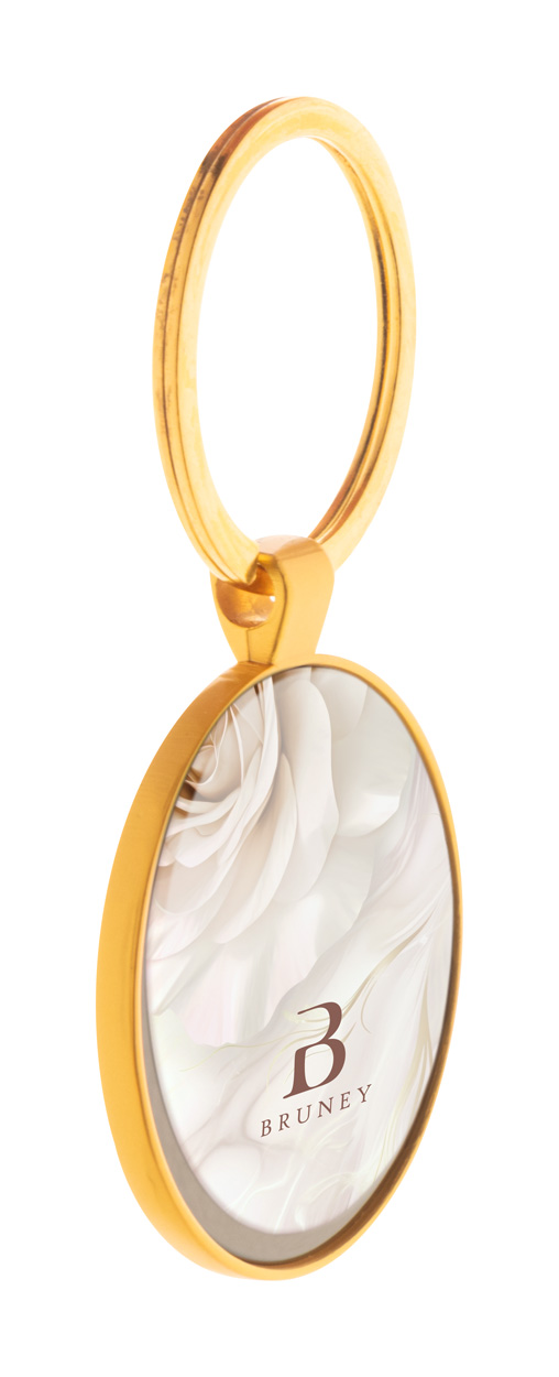 Runder Metallschlüsselanhänger mit goldfarbener Oberfläche mit Gunmetal-Plättchen. Einzeln in Kraftpapierbox.