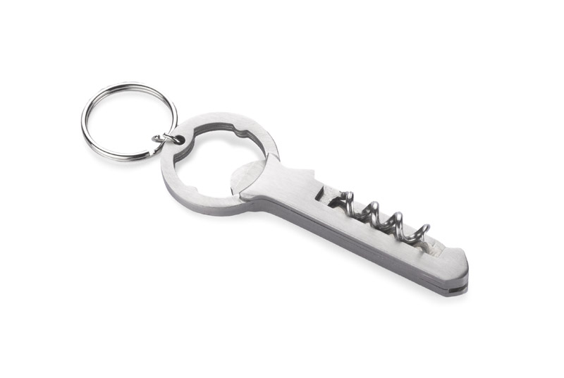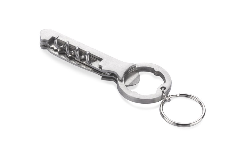 Alco hat 3 Funktionen: Schlüsselanhänger, Flaschenöffner und Weinkorkenzieher. Hergestellt aus Edelstahl. Verpackt in einer braunen Pappschachtel.