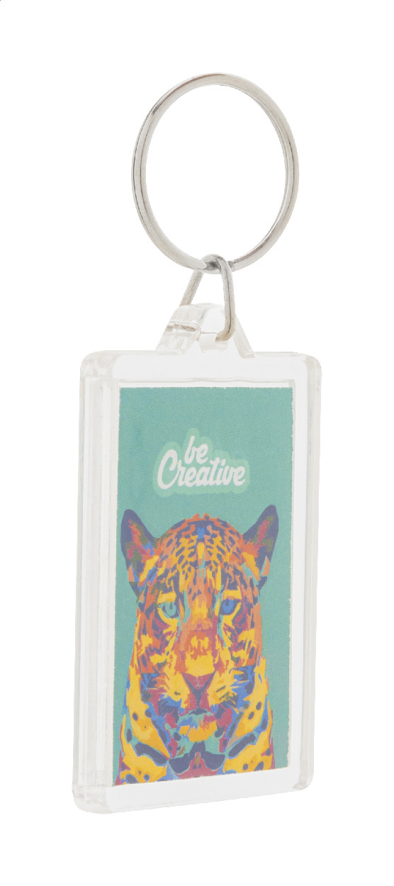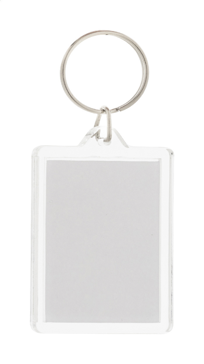 Rechteckiger Schlüsselanhänger aus Acryl mit individueller, vollfarbiger Papiereinlage und Metallring. Der Preis ist inkl. beidseitigem Digitaldruck. Mindestmenge: 100 Stk.