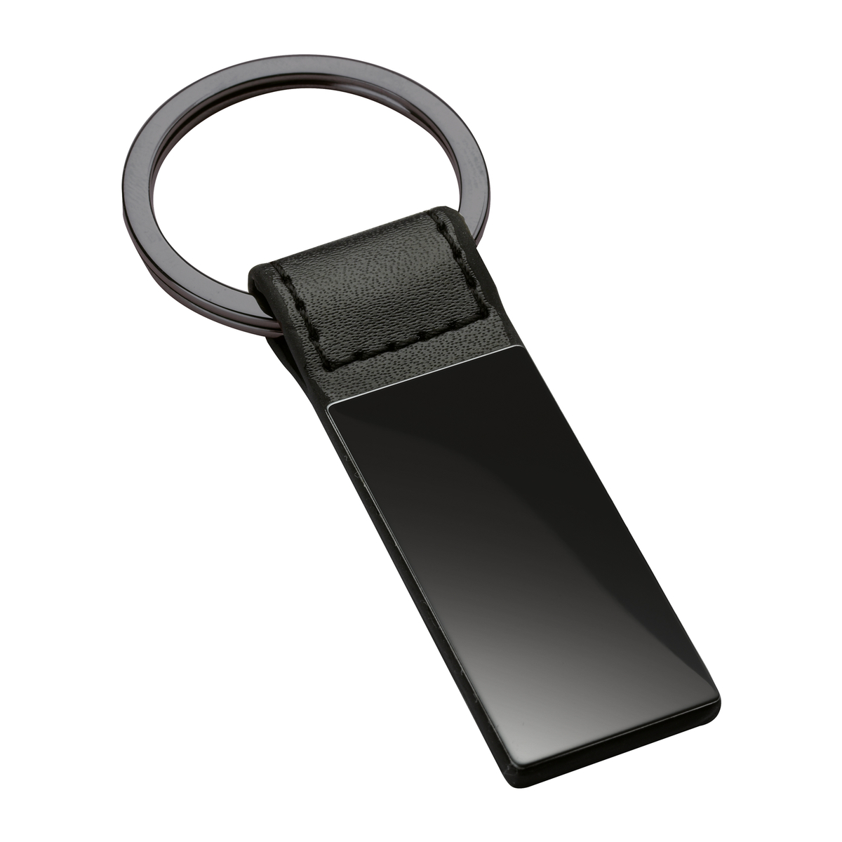 Der Schlüsselanhänger ist aus schwarzem Kunstleder und zeigt eine schwarzglänzende Gunmetal-Plattierung auf dem veredelbaren Metallstück des Anhängers. Die Individualisierungsmethode der Wahl ist eine edle und hochwertige Lasergravur, die den Anhänger zu einem echten Prachtstück werden lässt.