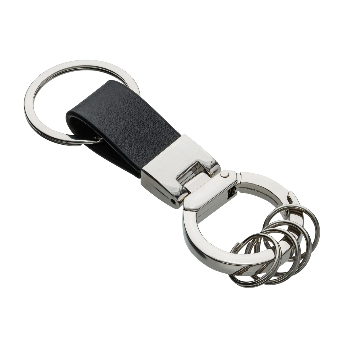 Schlüsselanhänger aus Kunstleder: Edle Anmutung durch ansprechende Kombination der Materialkomponenten und hochwertige Geschenkverpackung, inklusive vier kleiner, am Karabiner befestigter Schlüsselringe.