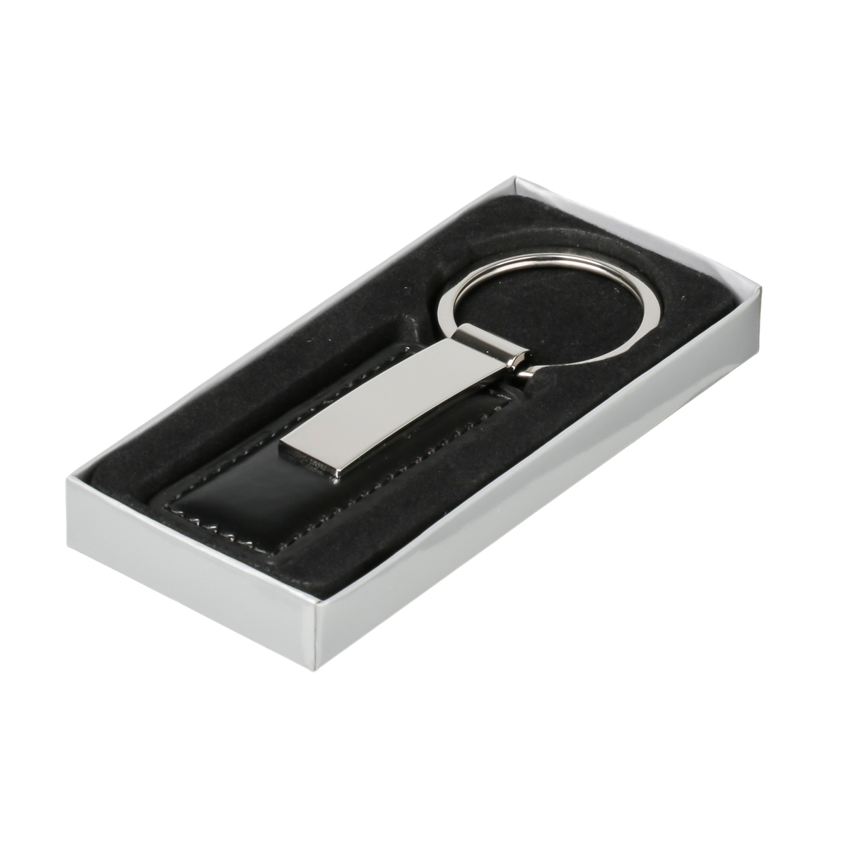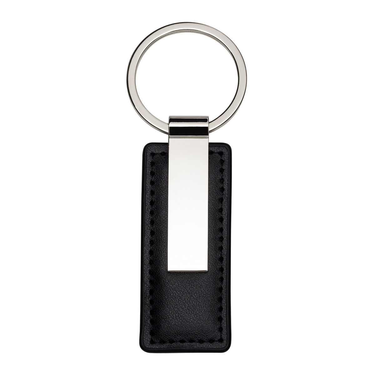 Eine günstigere und schöne Kunststoffalternative zum Lederklassiker, der rechteckige Schlüsselanhänger mit Steppnaht und metallglänzender Gravurplatte.