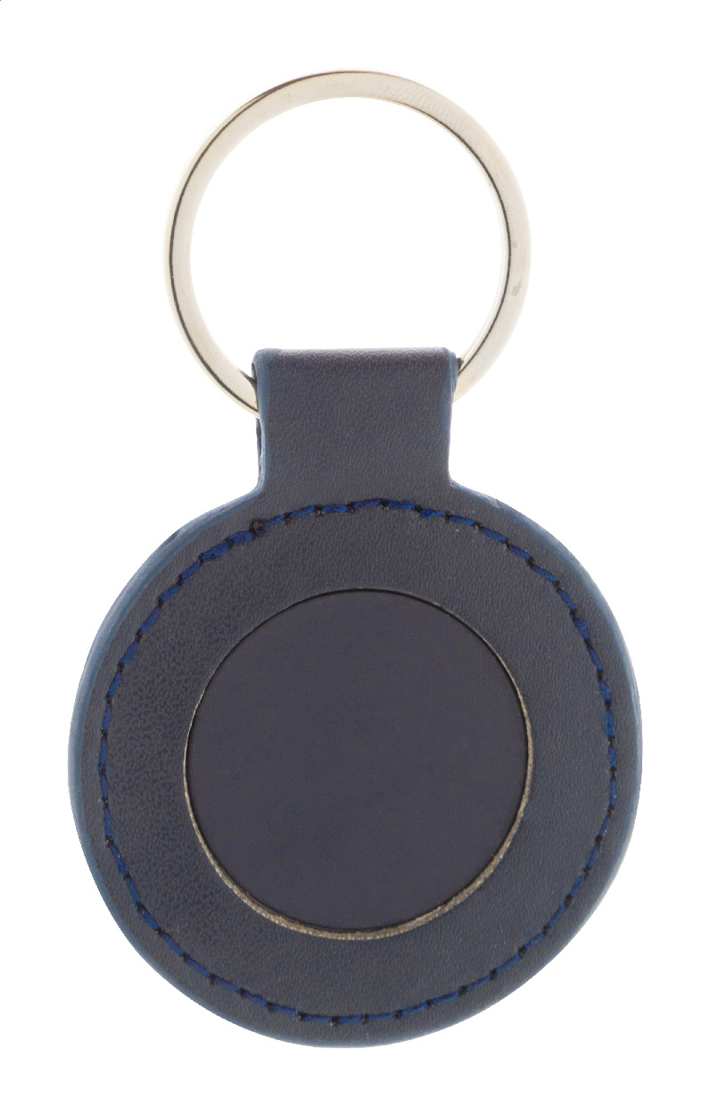 Runder Schlüsselanhänger aus recyceltem PU-Leder mit Metallring und Logoplatte aus Edelstahl mit gummierter Oberfläche. Mit Spezialbeschichtung für Spiegelgravur.