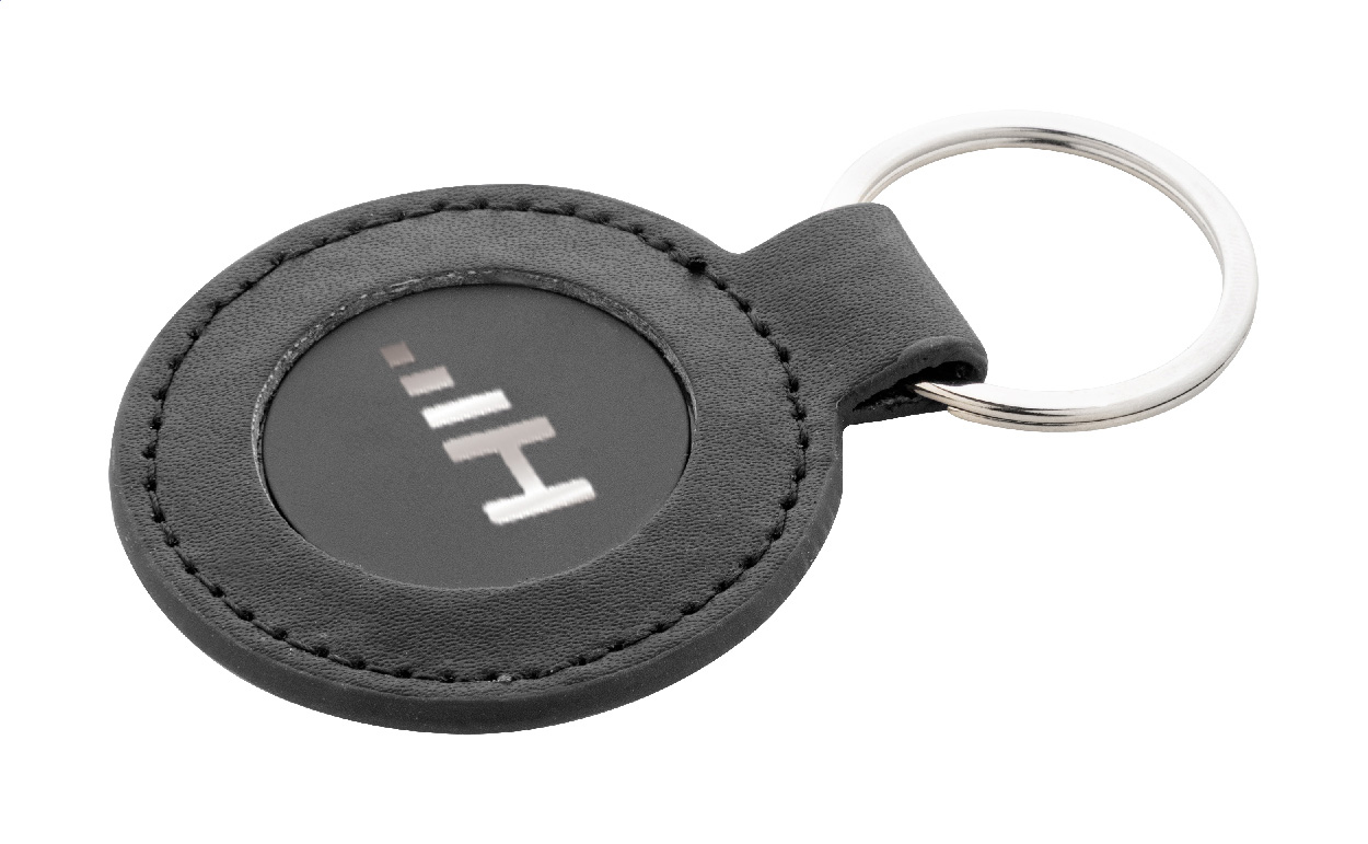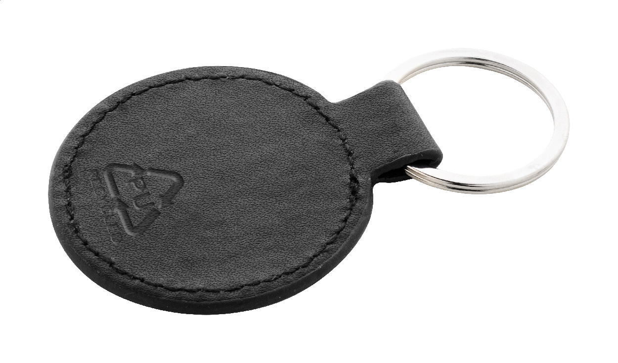 Runder Schlüsselanhänger aus recyceltem PU-Leder mit Metallring und Logoplatte aus Edelstahl mit gummierter Oberfläche. Mit Spezialbeschichtung für Spiegelgravur.