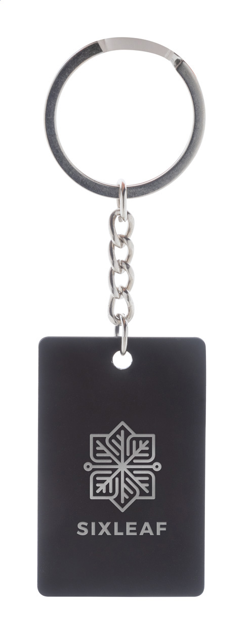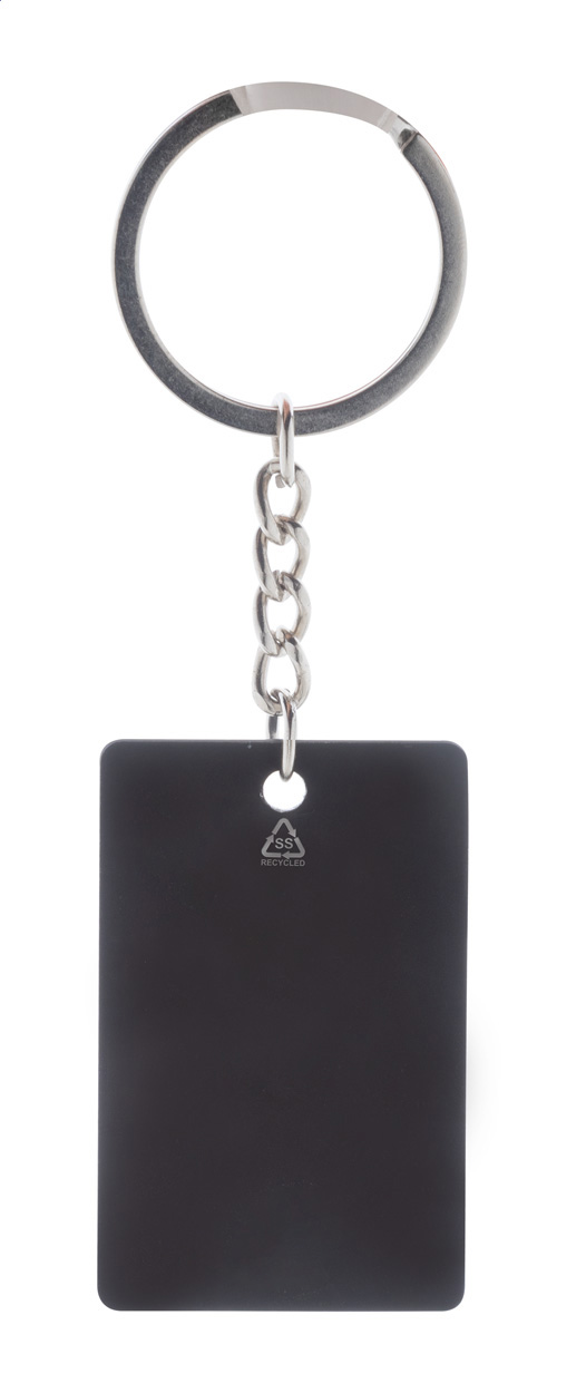 Rechteckiger Schlüsselanhänger aus recyceltem Edelstahl mit gummierter Oberfläche undspezieller Beschichtung für Spiegelgravuren.