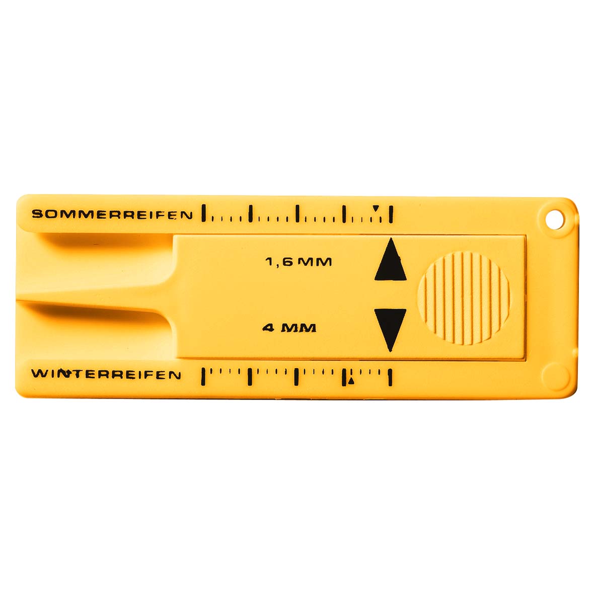 Immer griffbereit. Reifenprofilmesser mit Öse zum Befestigen am Schlüsselbund. Ohne Schlüsselring.