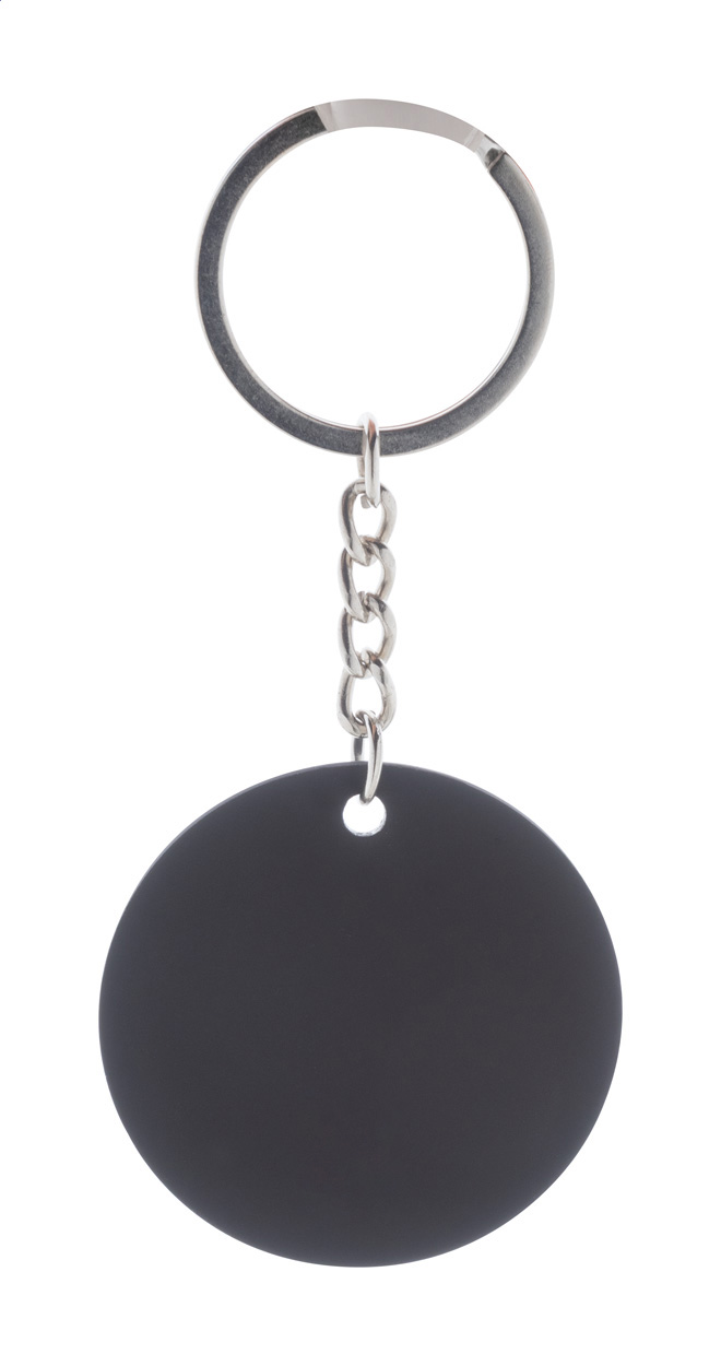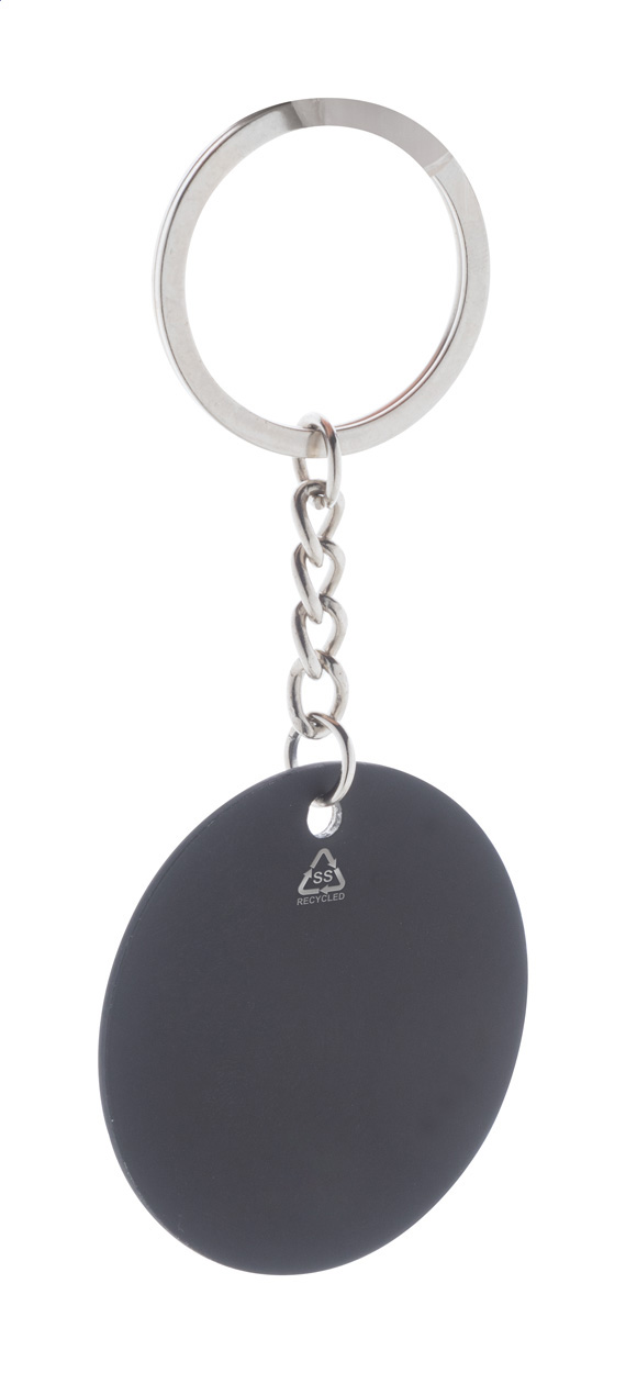 Runder Schlüsselanhänger aus recyceltem Edelstahl mit gummierter Oberfläche undspezieller Beschichtung für Spiegelgravuren.