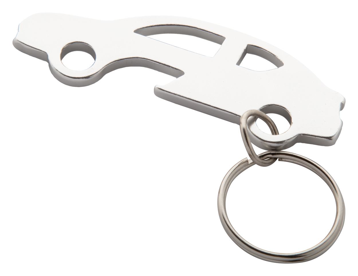 Schlüsselanhänger mit Flaschenöffner in Autoform. Material: Aluminium.