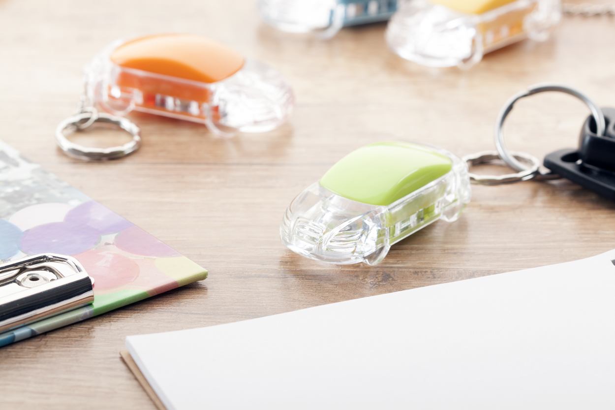 Schlüsselanhänger aus Kunststoff in Autoform mit weißem LED-Licht und Metall-Schlüsselring. Inkl. Knopfzellenbatterie.