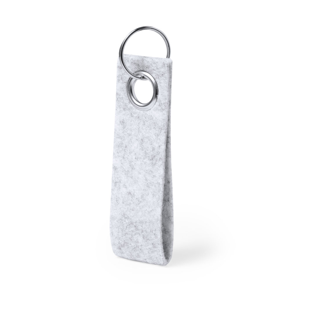 Eleganter Schlüsselanhänger mit Filz-RPET-Band und verchromter Metallöse. Mit dem unverwechselbaren Felt RPET auf dem Band und dem verchromten Metallring. Felt RPET ist das Ergebnis der Kombination der Recyclingprozesse von Kunststoffen mit der jahrtausendealten Technik der Filzherstellung, was zu einem Öko-Trend-Material führt, das nicht nur recycelten Ursprungs ist, sondern auch wiederverwertet werden kann.