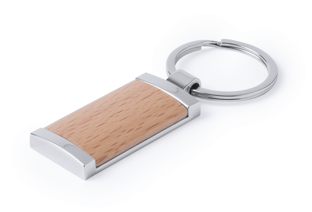 Schlüsselanhänger aus einer Kombination von glänzendem Metall und Naturholz. Mit großer Fläche zum Bedrucken und erhältlich mit kreisförmigem und rechteckigem Design. Präsentiert in einem Beutel mit Kartonverstärkung in Silber.