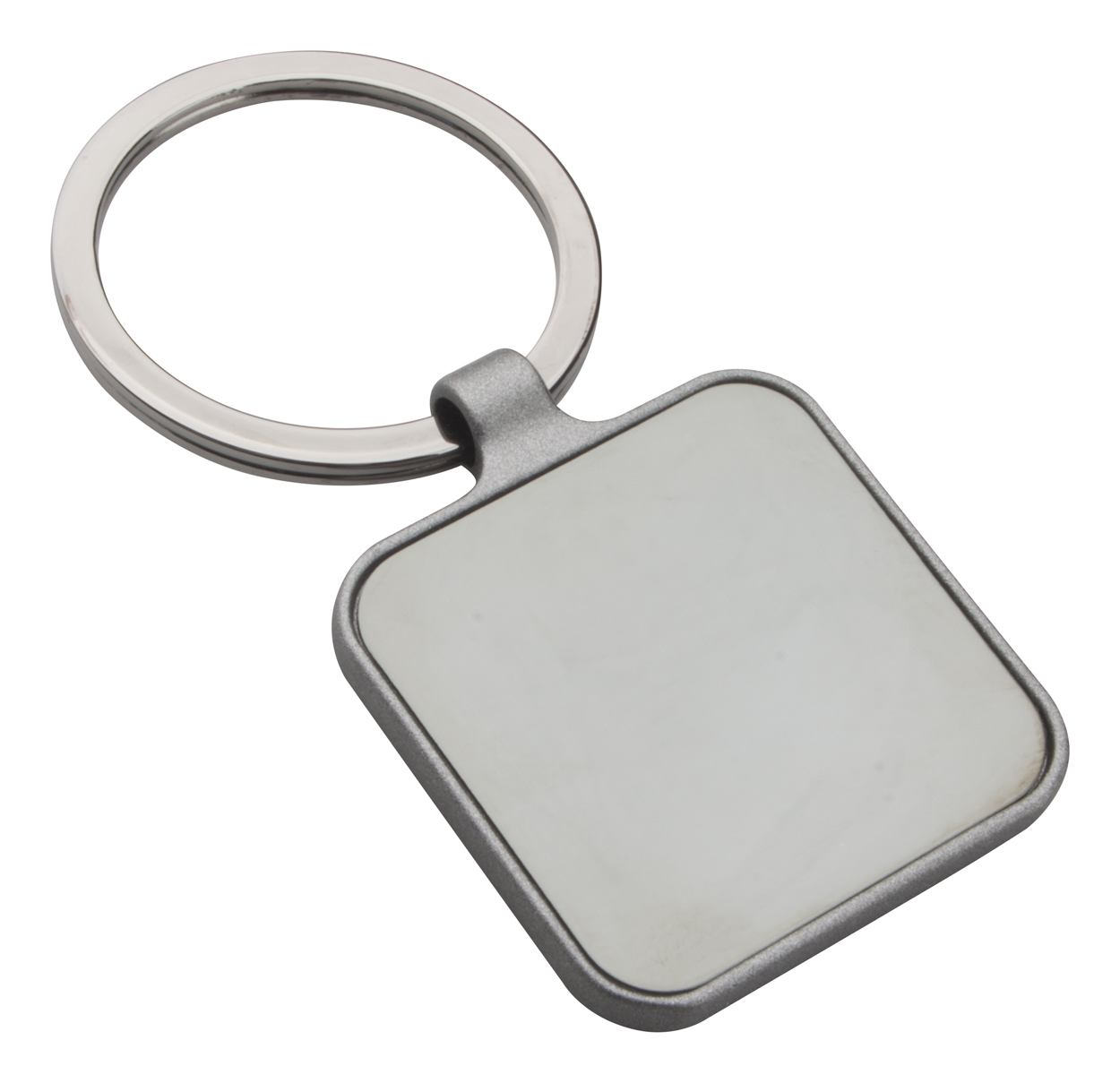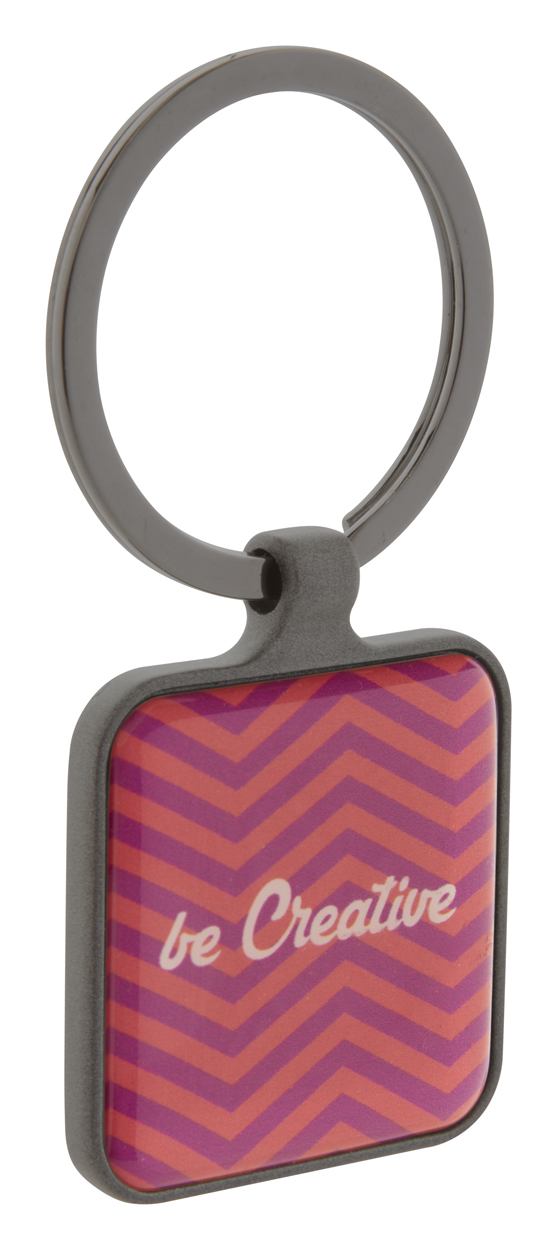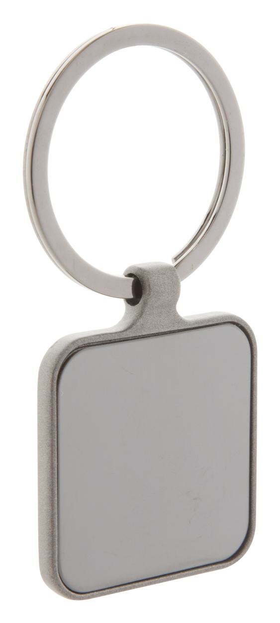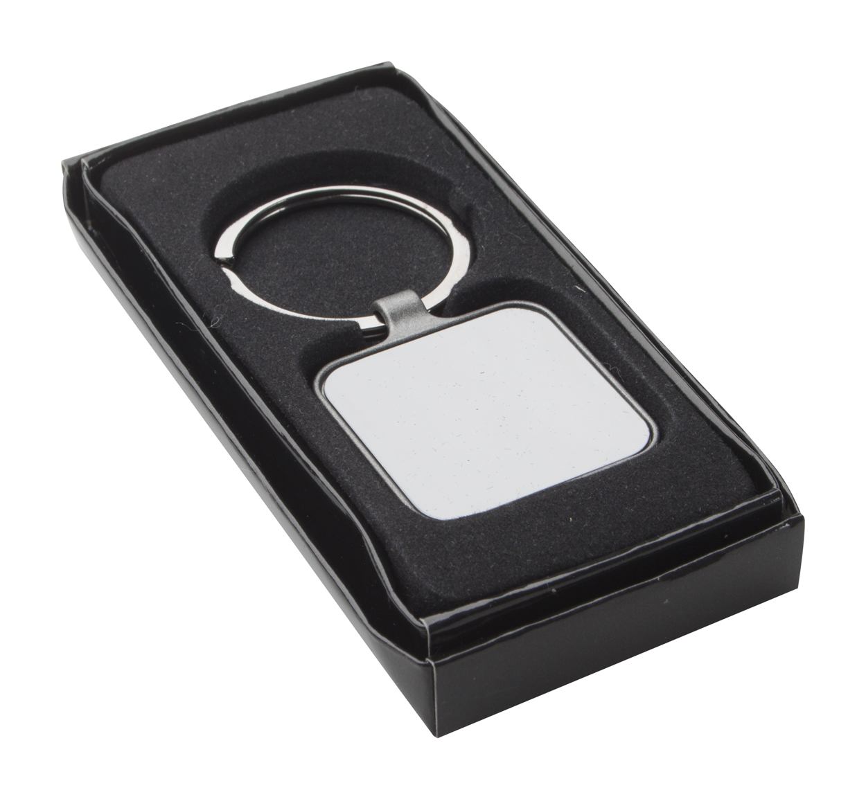 Quadratischer Schlüsselanhänger aus Metall mit Gun-Metal-Oberfläche und polierten Plättchen auf beiden Seiten. Einzeln in schwarzer Geschenkbox.