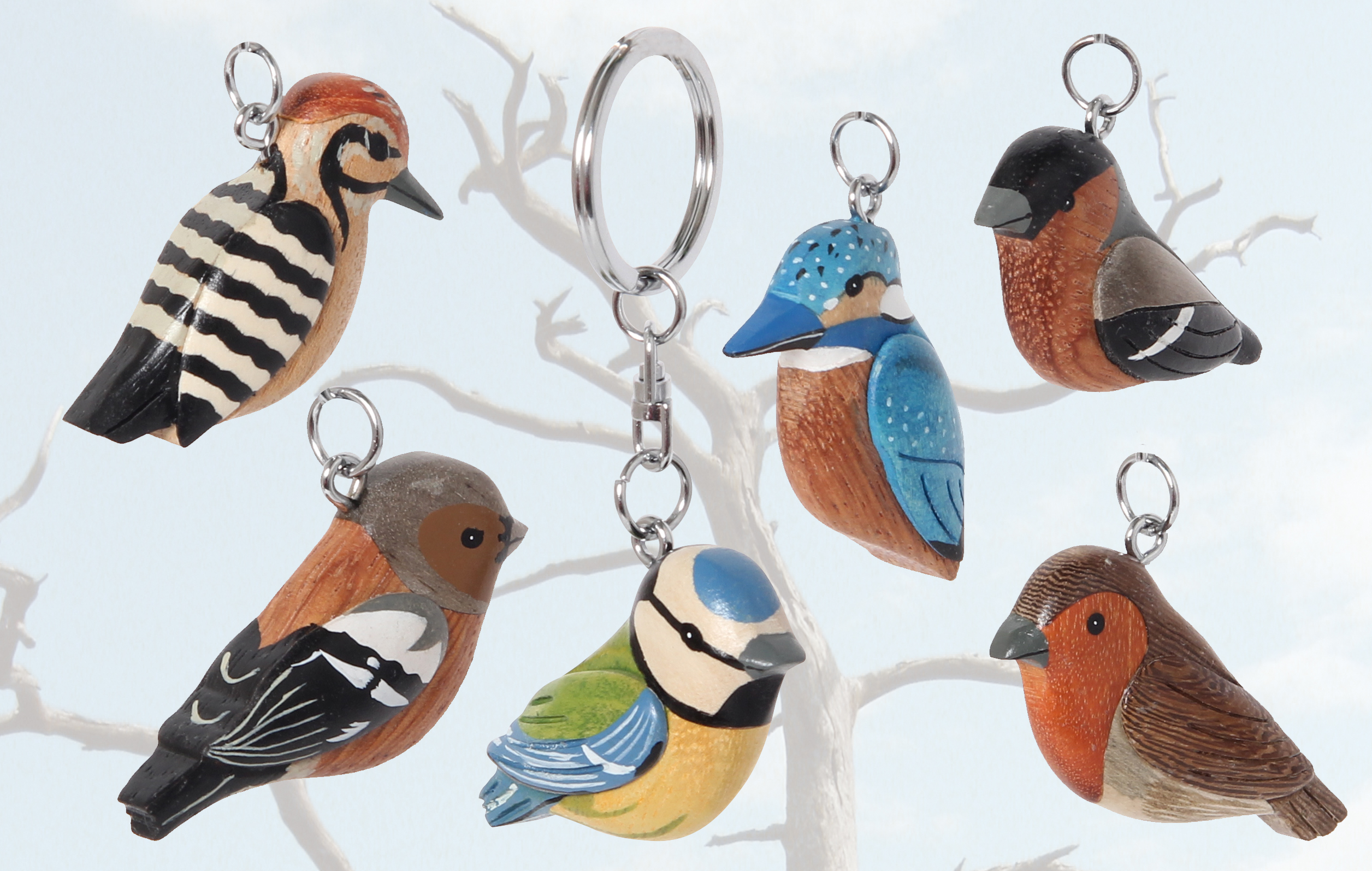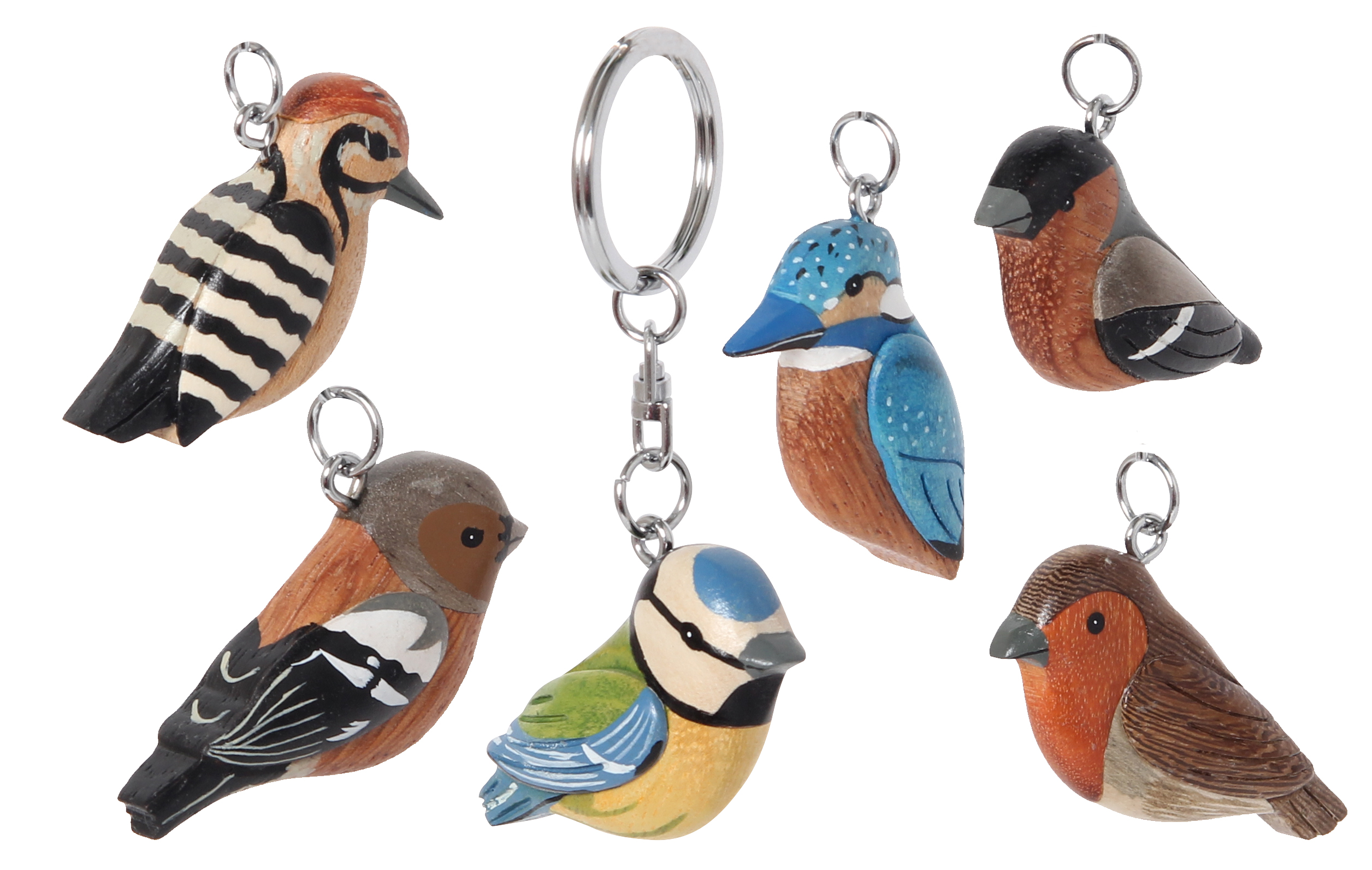 Detaillreich gestaltete Schlüsselanhänger aus Edel-Hölzern. Sechs verschiedene Vogelarten sortiert.