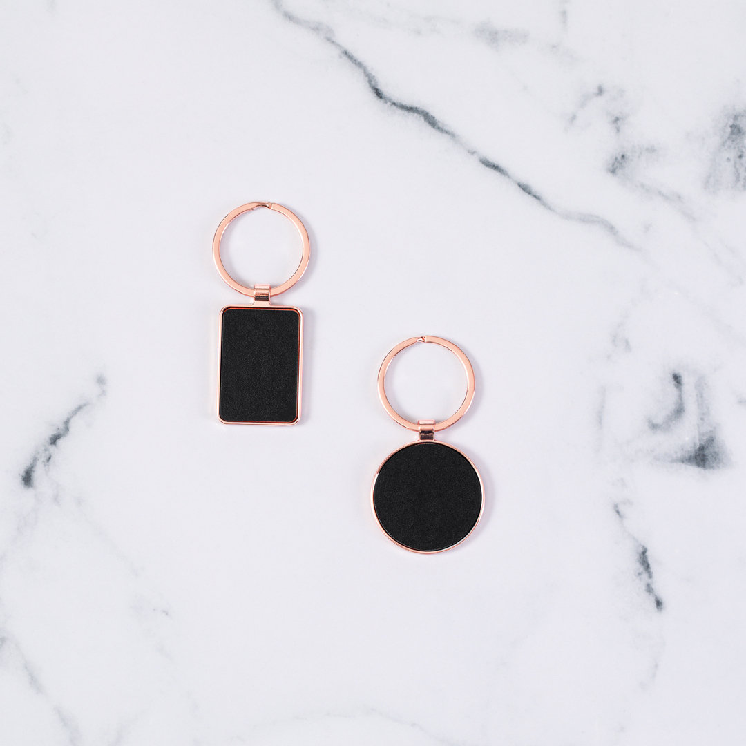Anspruchsvoller Schlüsselanhänger aus Metall mit verzinkter Kupferbeschichtung und glänzender Oberfläche. Einseitig mit elegantem PU-Leder gefüttert und in rechteckiger und kreisförmiger Ausführung erhältlich. Einzeln präsentiert in einer recycelten Papiertüte.