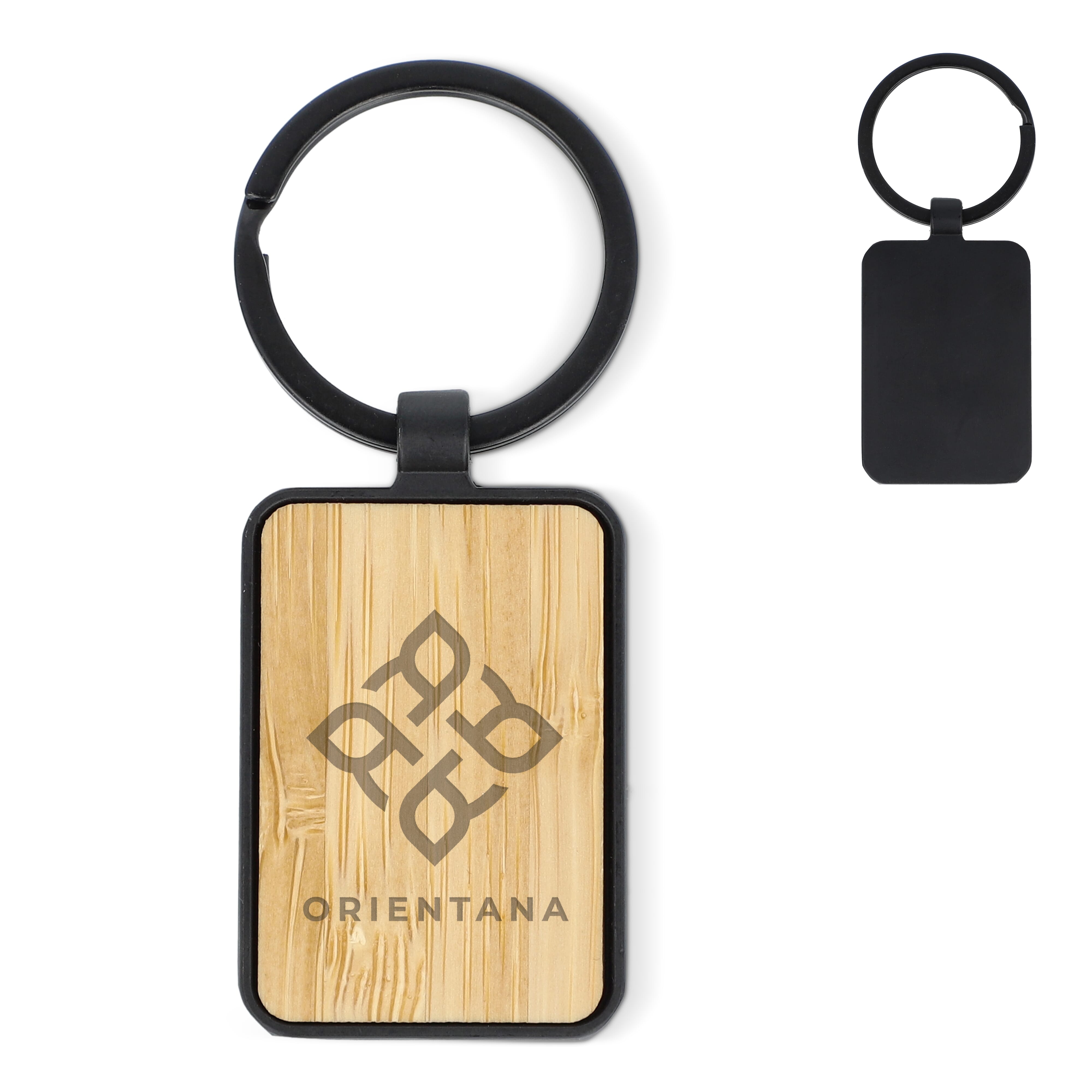 Halten Sie Ihre Schlüssel stilvoll organisiert mit unserem Schlüsselanhänger aus Bambus und Metall in einer rechteckigen Form.