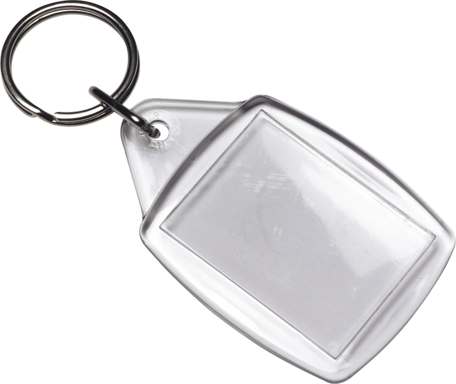 Schlüsselanhänger aus Kunststoff, mit transparentem Fotofenster und Schlüsselring aus Metall. Der Druck erfolgt auf einem Papiereinleger.