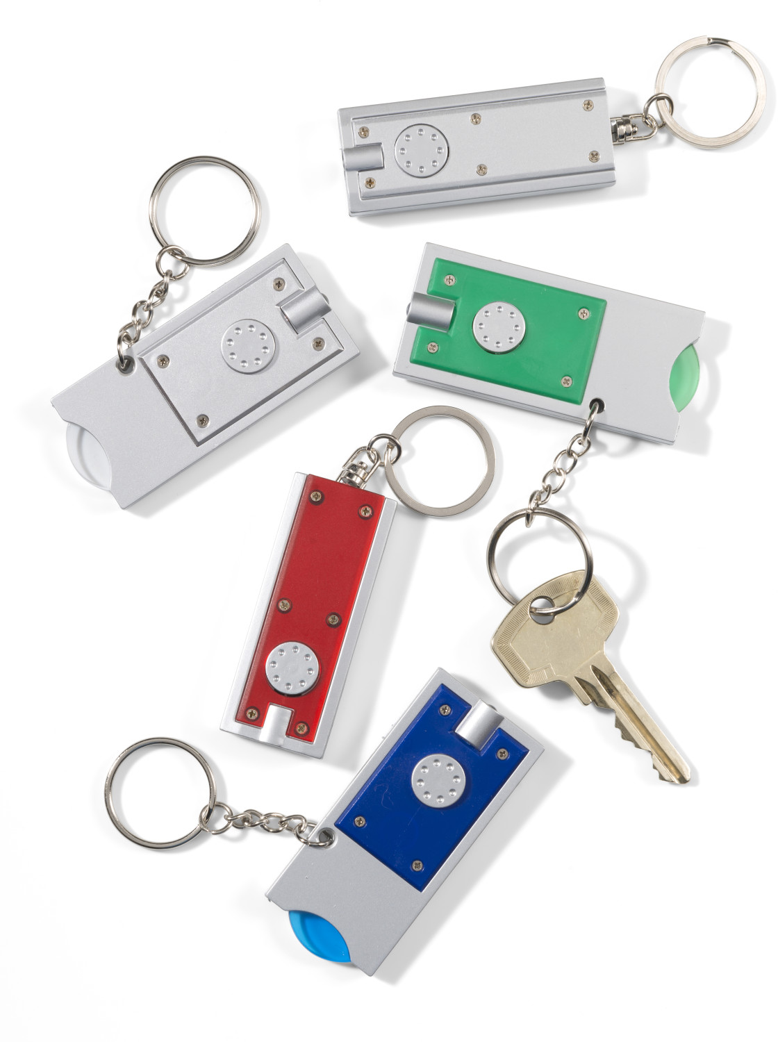 Schlüsselanhänger aus Kunststoff, mit Einkaufswagenchip aus Kunststoff, LED-Lampe (weiß) und Metall-Schlüsselkette.