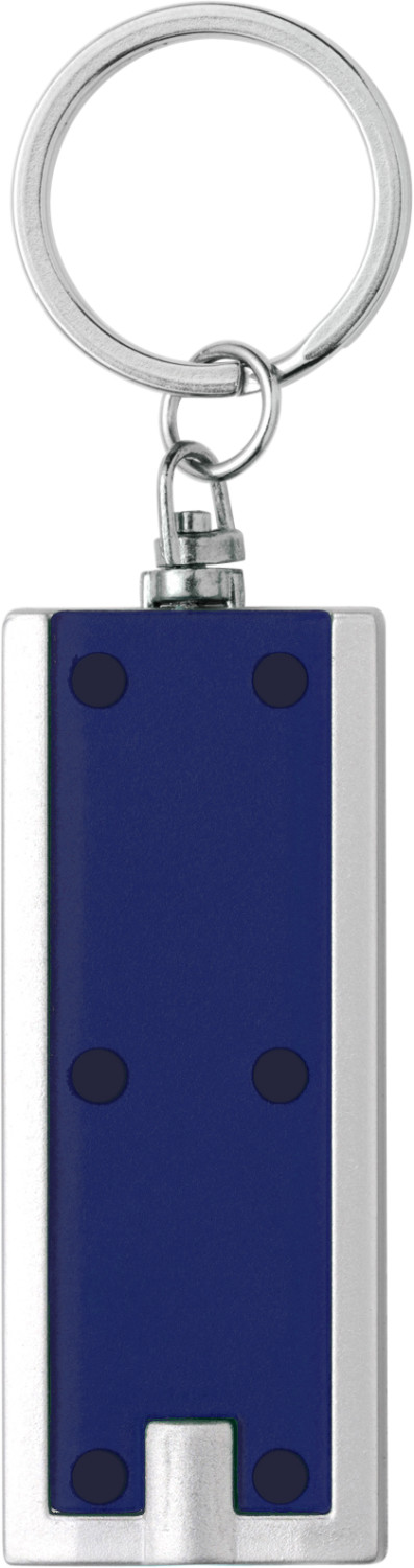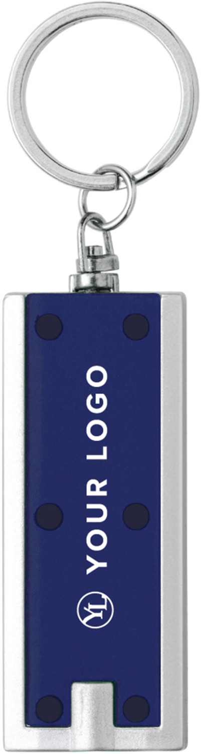 Schlüsselanhänger aus Kunststoff, mit LED-Lampe (weiß) und Metall-Schlüsselring.
