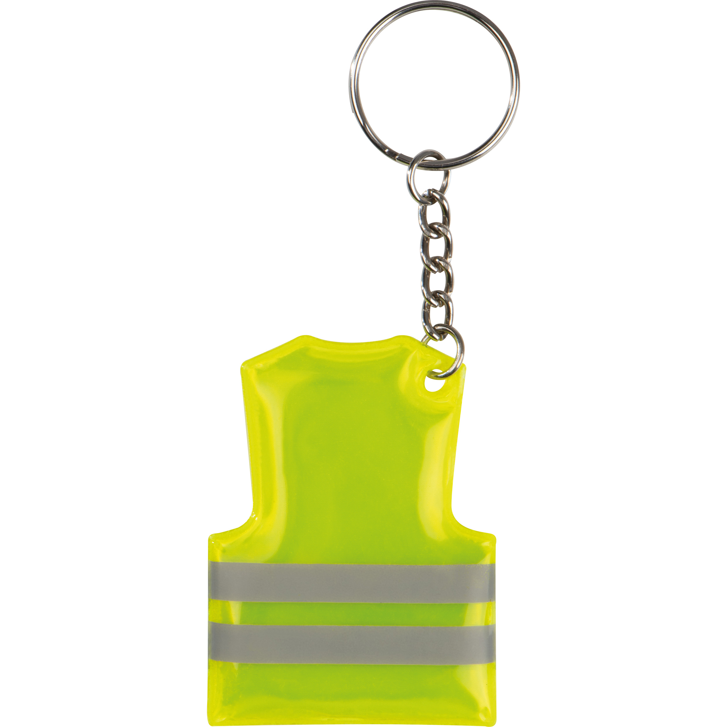 Schlüsselanhänger aus Kunststoff in der Form einer Sicherheitsweste mit Leuchtstreifen. Ihre Werbung drucken wir auf die Weste.