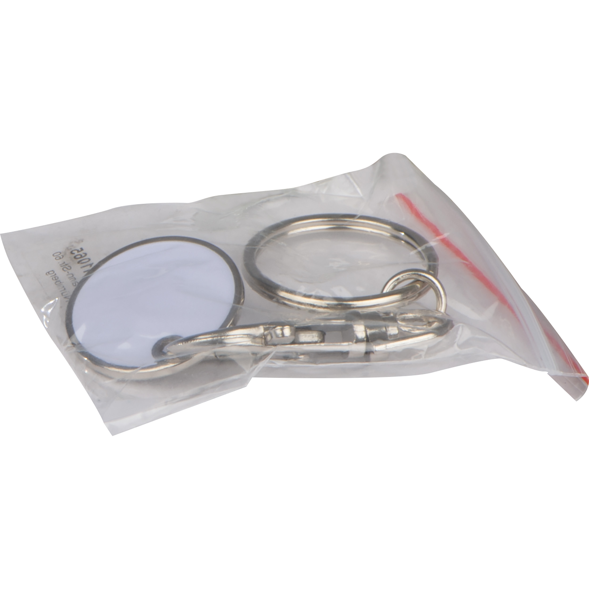 Schlüsselanhänger mit einem durch einen Karabinerhaken abnehmbaren Einkaufschip. Ihre Werbung gravieren wir auf die silberne Seite des Chips.
