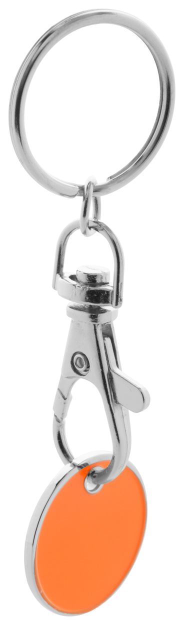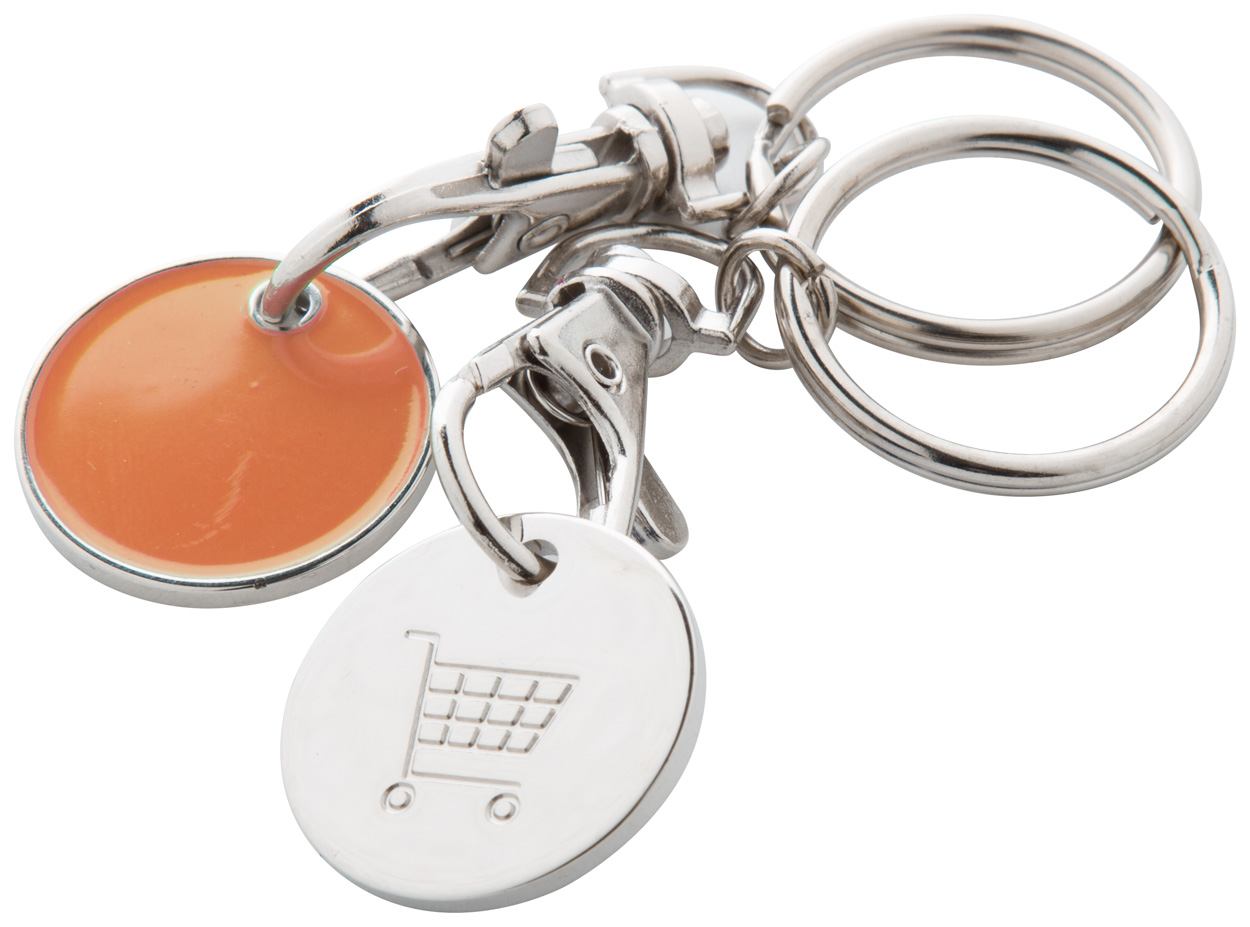 Metall-Schlüsselanhänger mit Einkaufswagen-Chip. Chip mit einer farbigen Seite und Einkaufswagen-Motiv auf der Rückseite. Chipgröße: ø23×1,7 mm.