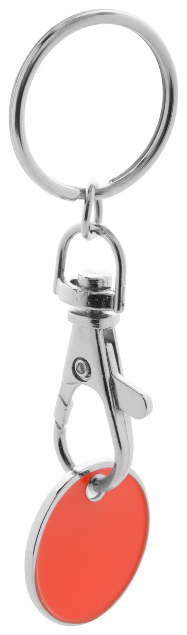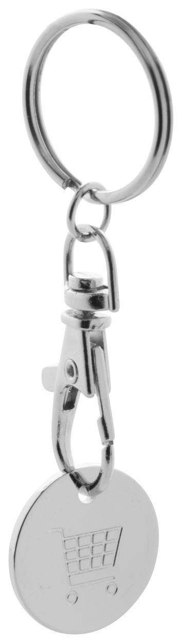 Metall-Schlüsselanhänger mit Einkaufswagen-Chip. Chip mit einer farbigen Seite und Einkaufswagen-Motiv auf der Rückseite. Chipgröße: ø23×1,7 mm.