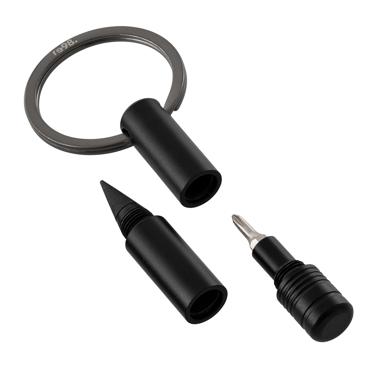 Der 3-in-1 multifunktionale Schlüsselanhänger ist ein nützlicher Helfer am Schlüsselbund. Ausgestattet mit einem magnetischen Bit und einer Endlos-Schreibspitze, bietet das Tool schnelle Lösung für unterwegs. Der Bit ist aus besonders hartem Stahl mit einer Rockwell Härte von 55 bis 60 HRC. Sowohl ein Schlitz- als auch ein Kreuzschlitzaufsatz stehen zur Verfügung. Diese sind ideal für Feinmechanik-Arbeiten, wie das Öffnen von Batteriefächern oder das Feststellen von Brillenbügeln. Die radierbare Endlos-Schreibspitze schafft Abhilfe, wenn ein Stift zur Hand sein muss. Hergestellt aus recyceltem Aluminium, liegt der schwarz eloxierte Schlüsselanhänger leicht und bequem in der Hand. Um auf den Bit oder die Schreibspitze zuzugreifen, drehen Sie den Korpus des Anhängers. Der Artikel ist durch Lasergravur veredelbar und wird in einer hochwertigen Geschenkverpackung geliefert.