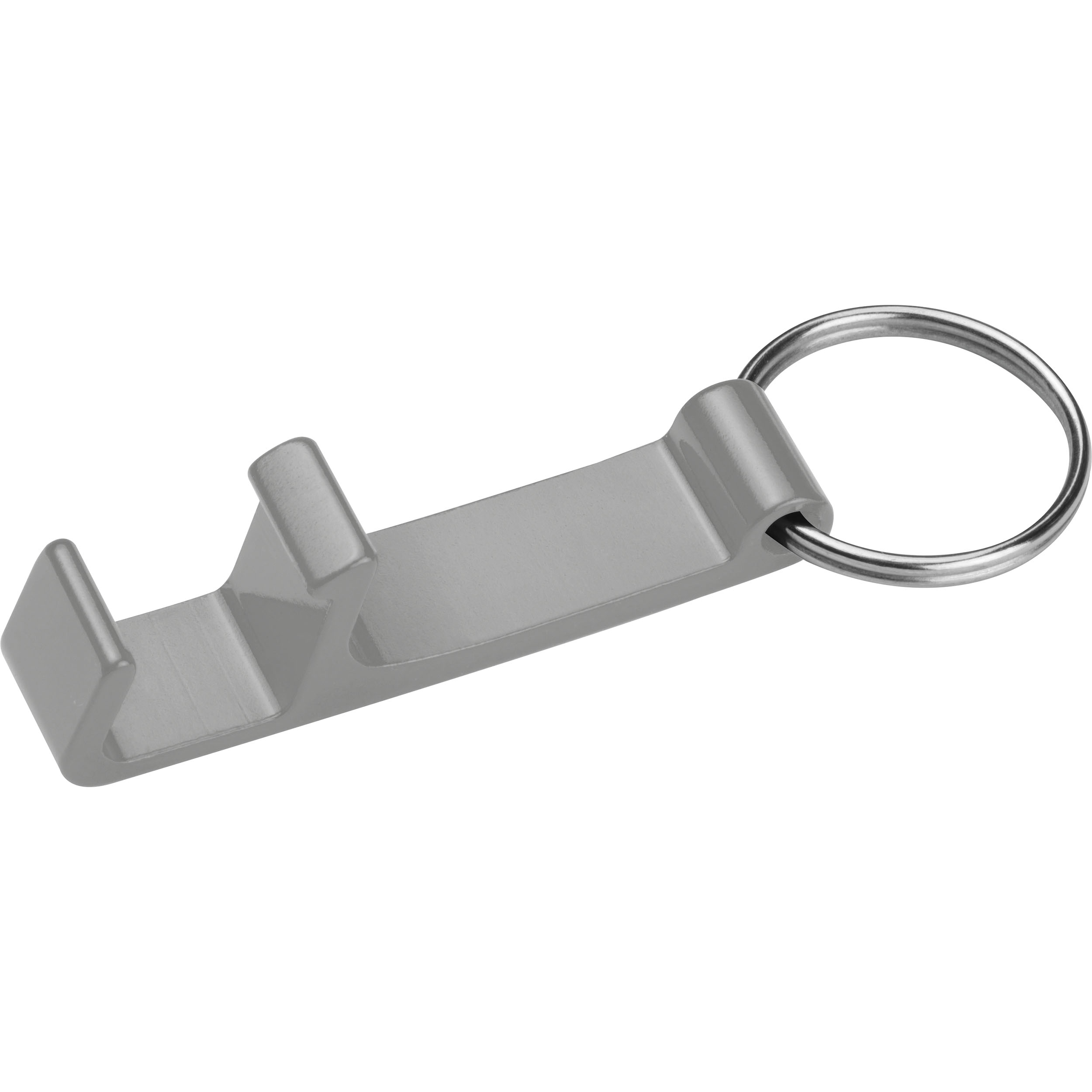 Schlüsselanhänger aus Metall mit Flaschenöffner, Dosenöffner und zusätzlich als Handyhalter verwendbar. Ihre Werbung wird auf den Anhänger graviert.