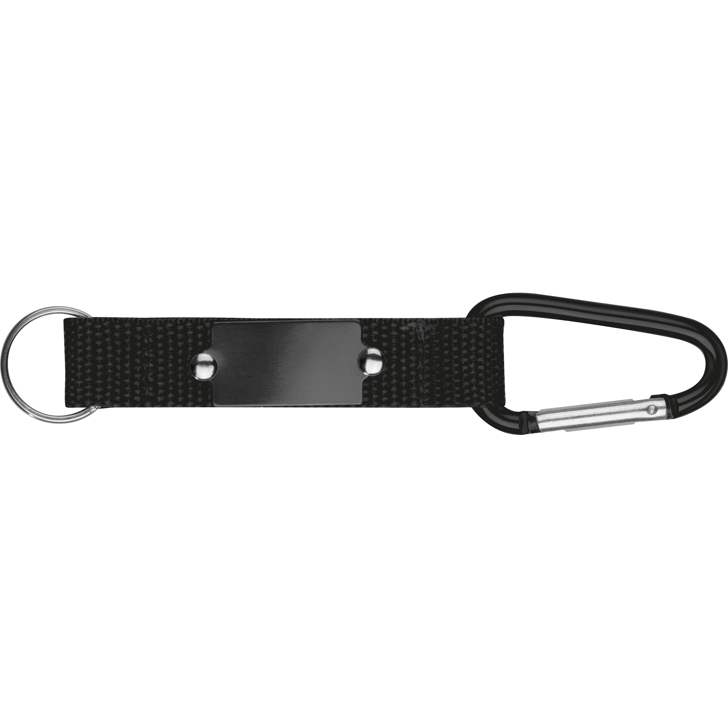Schlüsselanhänger mit Stoffband, Karabinerhaken und einem genieteten Metall-Label für Ihre Lasergravur.