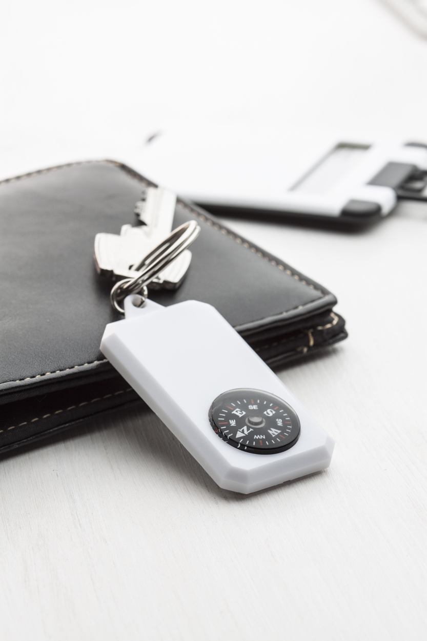 Schlüsselanhänger aus Kunststoff mit Kompass und Metallring.