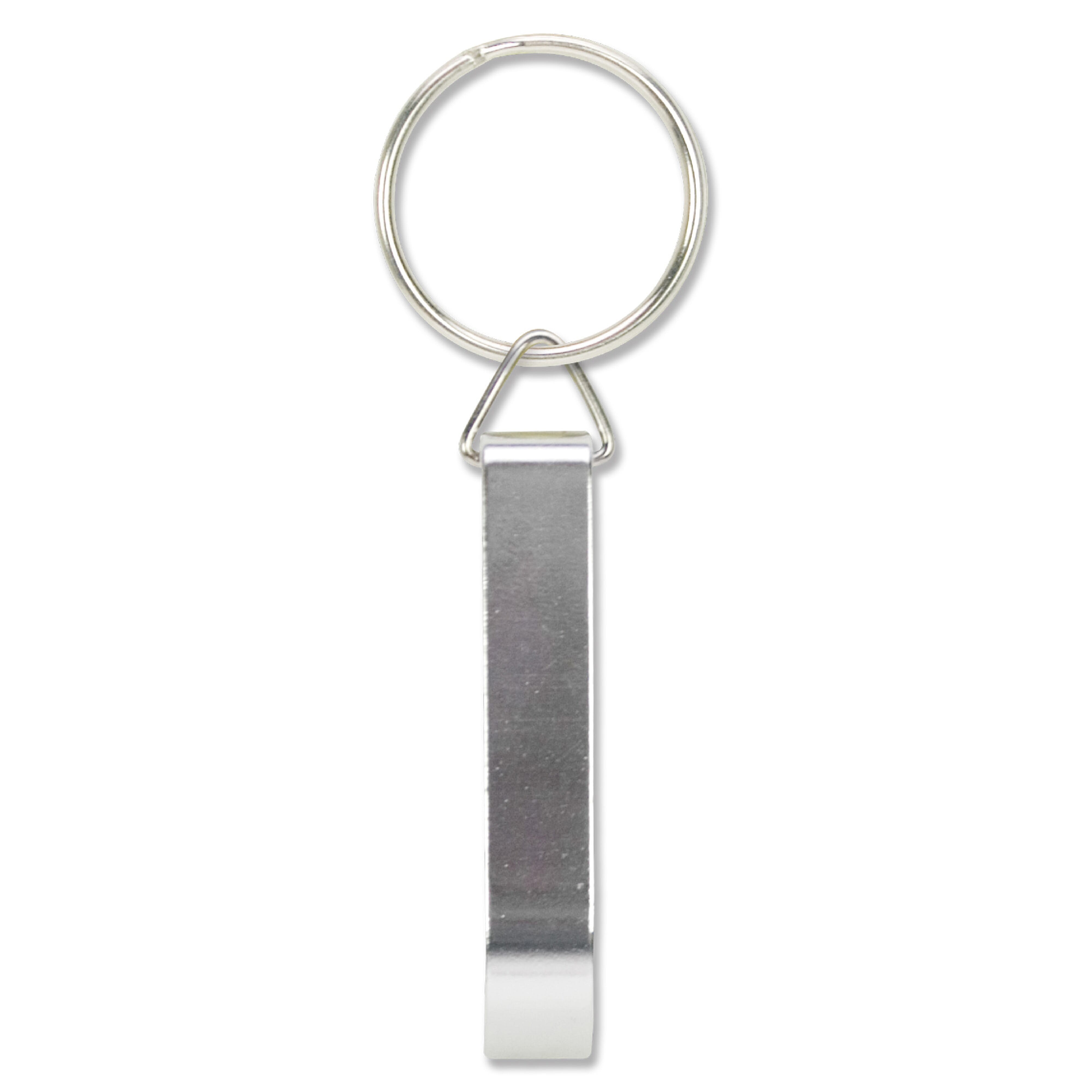Handlicher Aluminium-Schlüsselanhänger mit Flaschenöffner und Schlüsselring. Klein und praktisch.