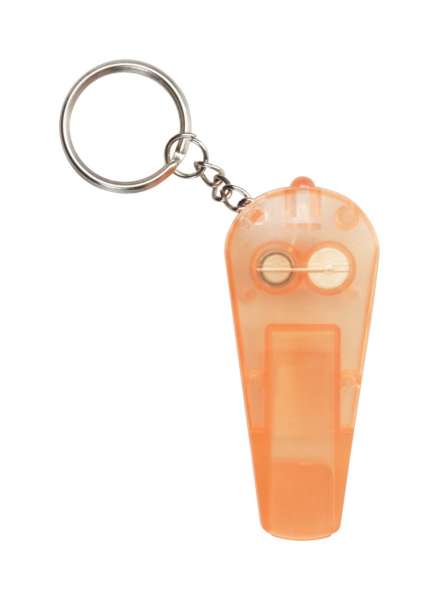 Transparente Pfeife aus Kunststoff mit Metall-Schlüsselring und weißem LED-Licht. Inkl. Knopfzellenbatterie.