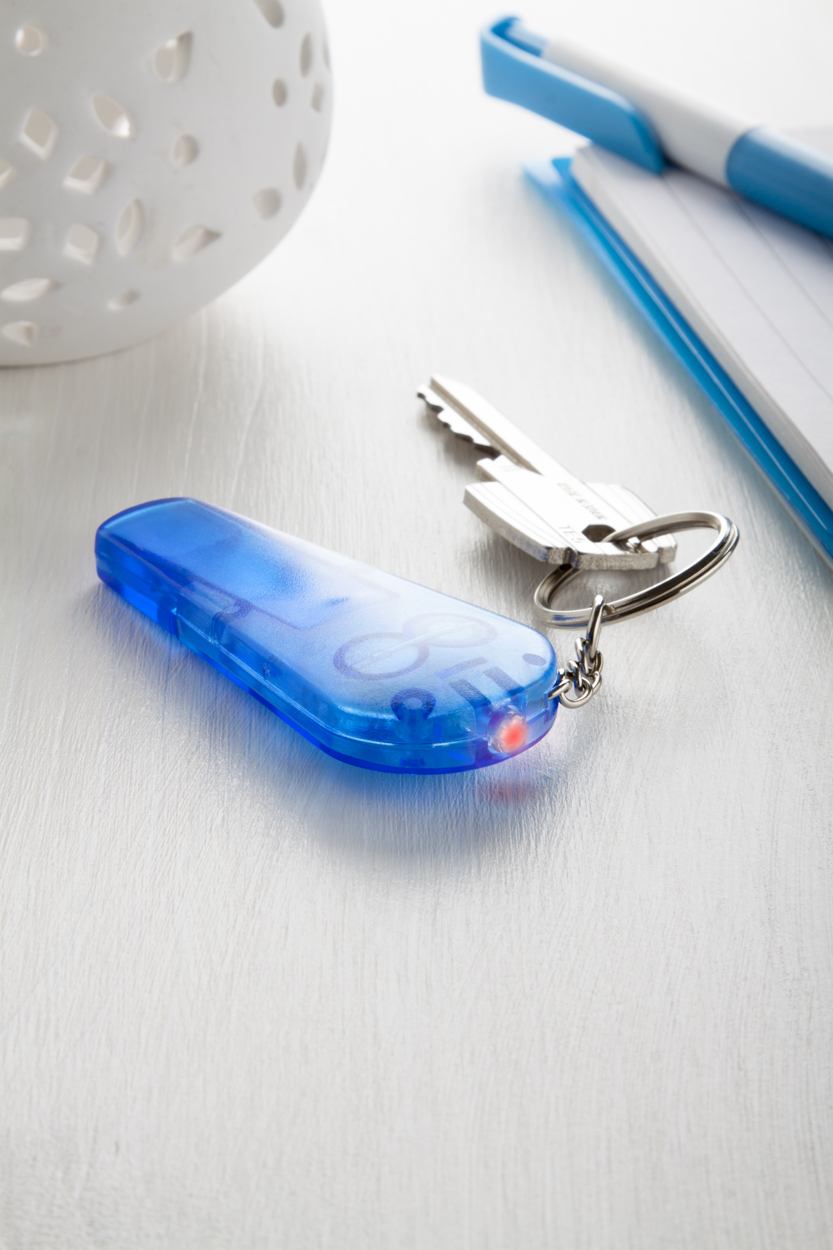 Transparente Pfeife aus Kunststoff mit Metall-Schlüsselring und weißem LED-Licht. Inkl. Knopfzellenbatterie.