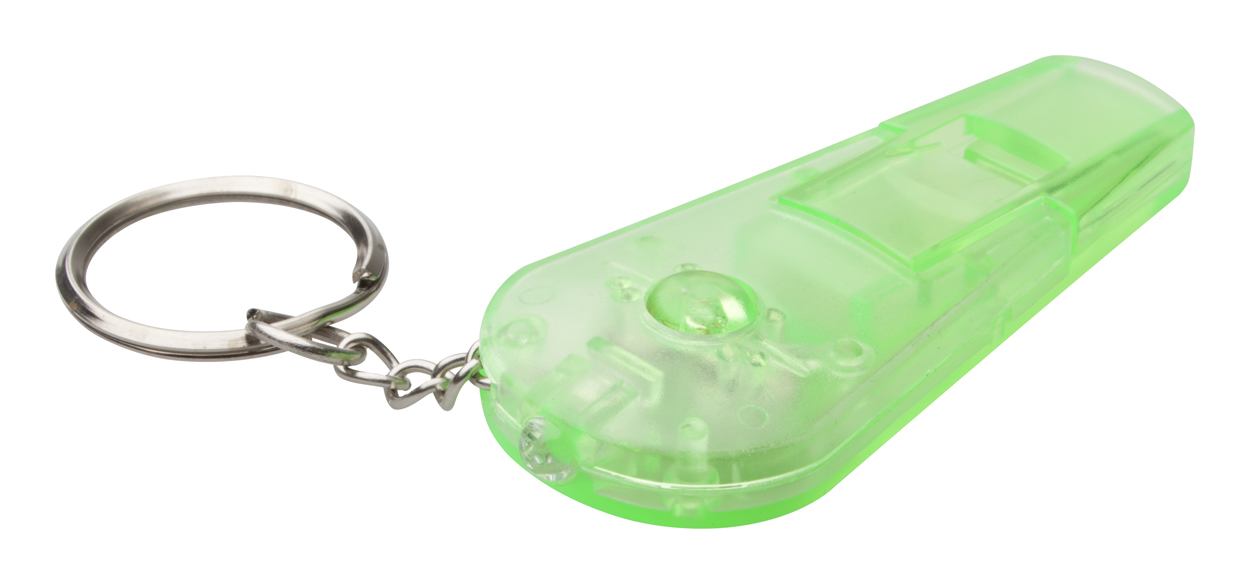 Transparente Pfeife aus Kunststoff mit Metall-Schlüsselring und weißem LED-Licht. Inkl. Knopfzellenbatterie.