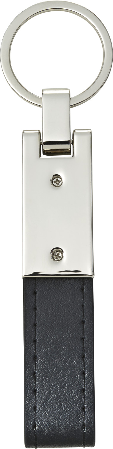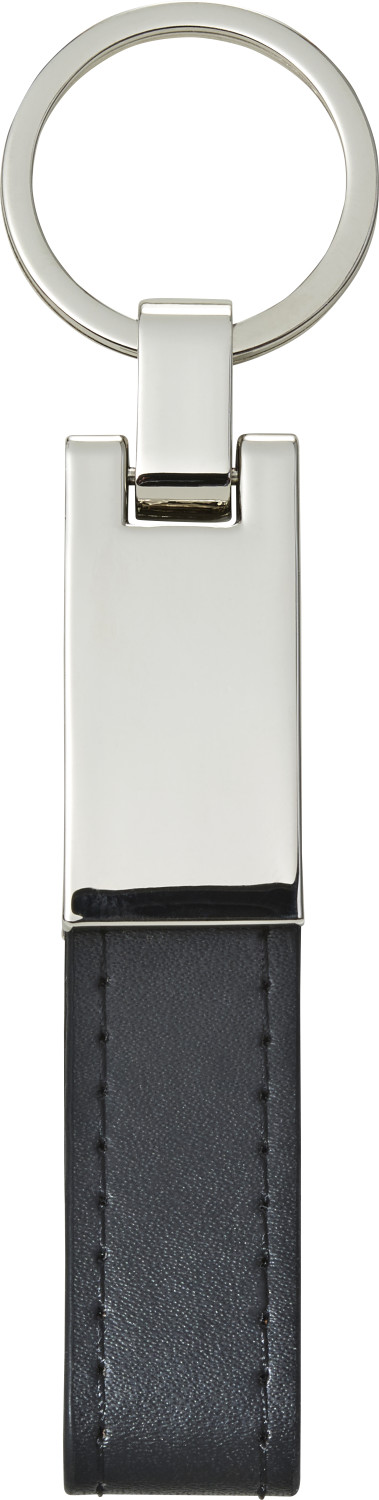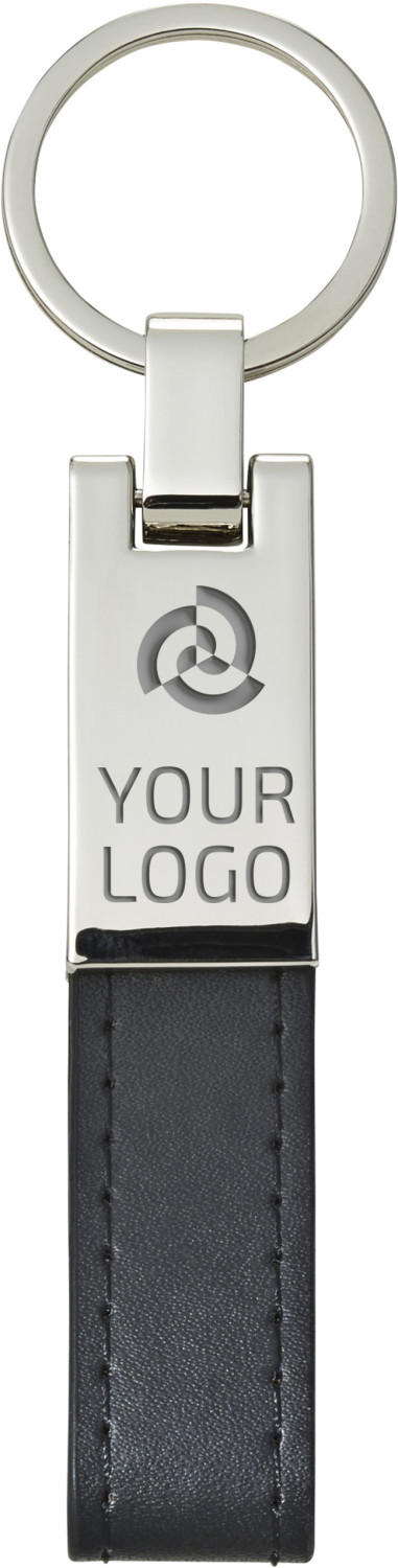 Schlüsselanhänger mit einer silberfarbenen Platte aus Stahl und einer Lasche aus PU Kunststoff. Verpackt in einer schwarzen Geschenkbox.