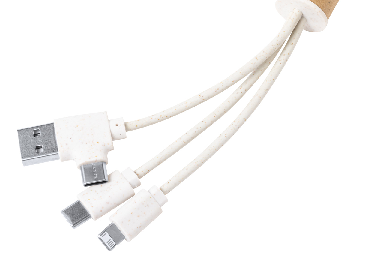 Schlüsselanhänger mit USB-Ladekabel aus Recyclingpapier und Weizenstrohkunststoff mit Mikro-USB, USB-C und Lightning-Steckern. Eingang über USB oder USB-C.