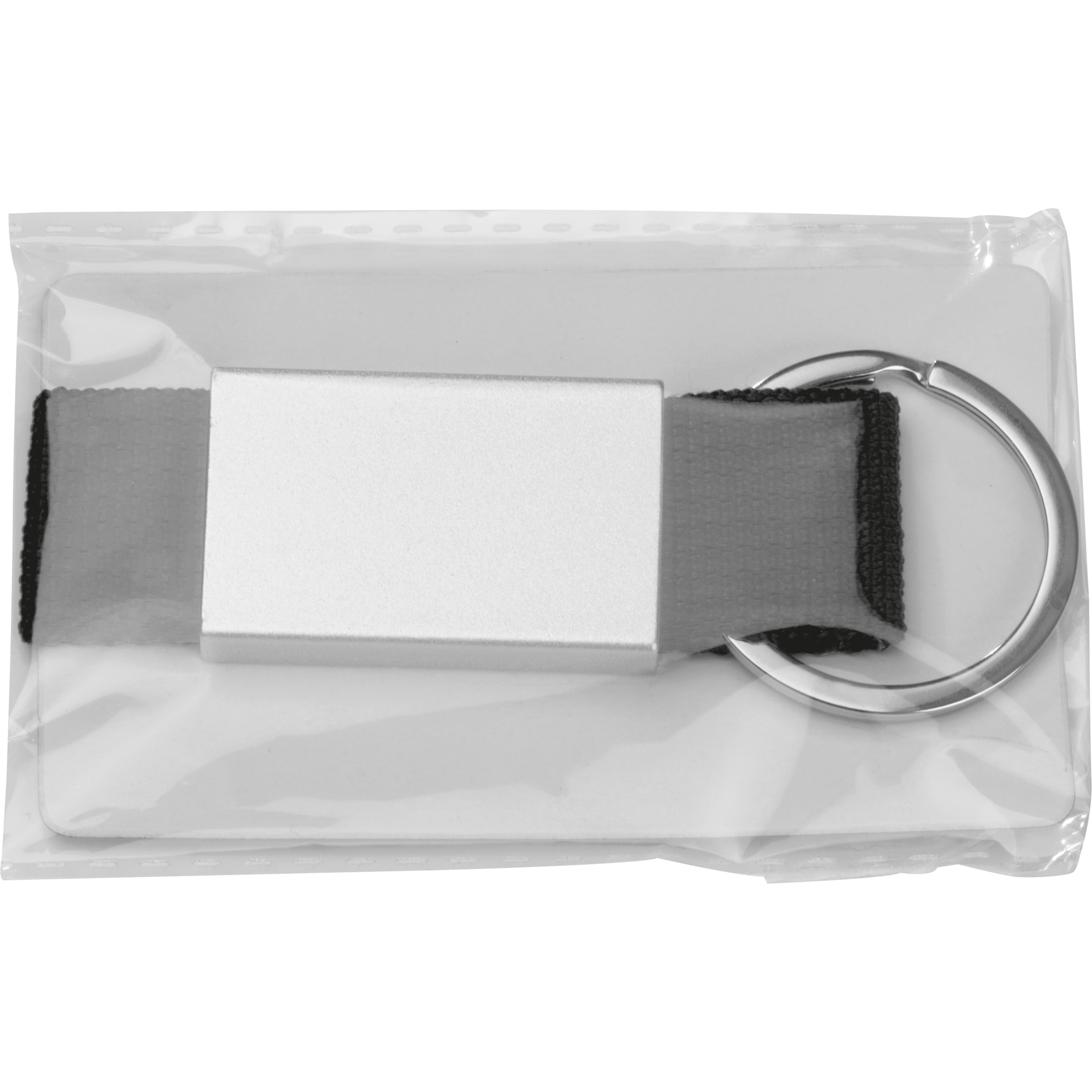 Schlüsselanhänger mit farbigem Stoffbändchen und glänzendem Metallplättchen, auf das Ihre Werbung mittels Lasergravur angebracht wird.